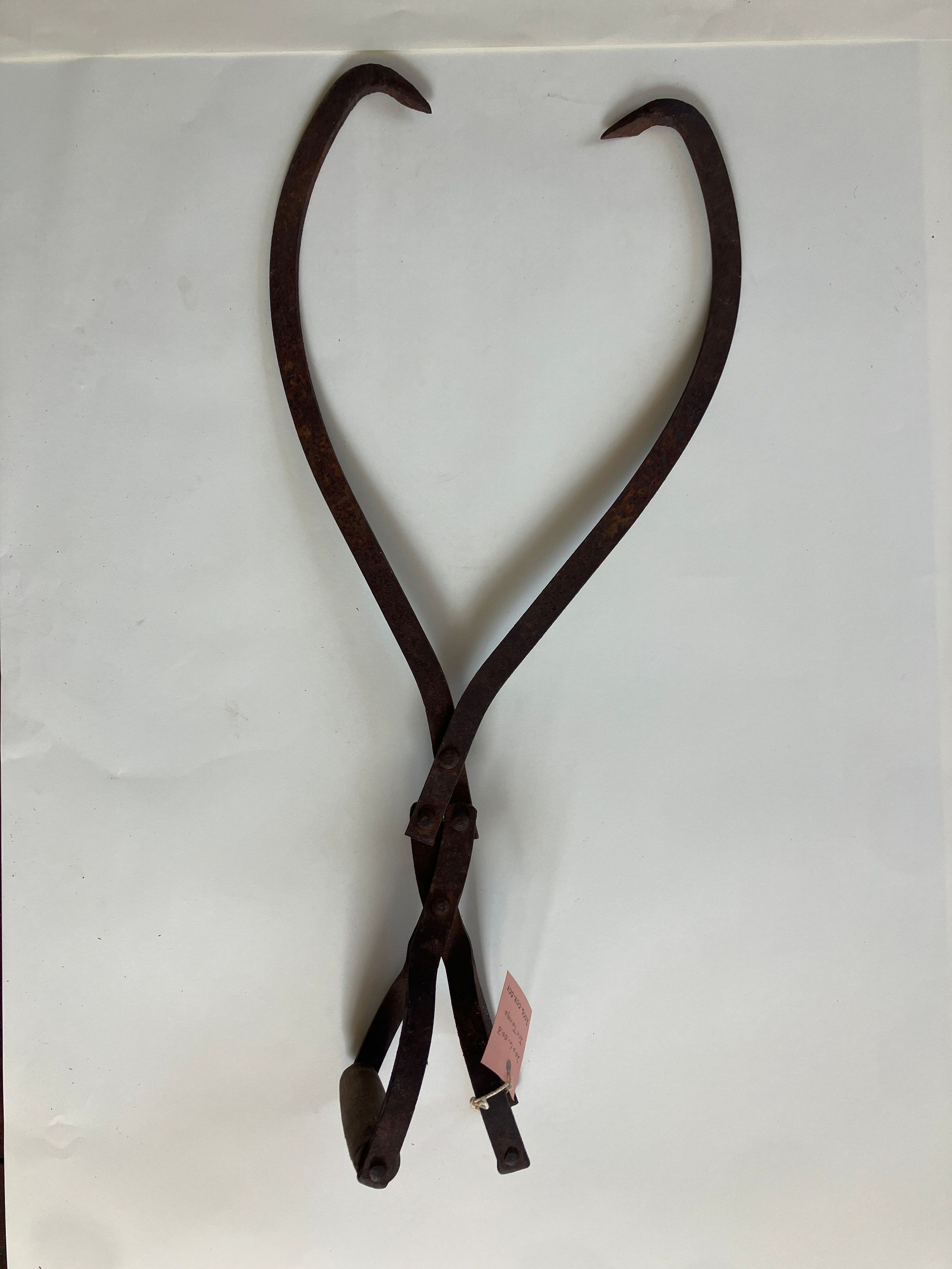 ice tongs -- metal, with two opposing tongs, metal handles, one with wooden grip, the other grip missing -- 27 inches long, 33 inches wide when extended fully . Came from the Clarence G Nevels grocery store in Dark Harbor, now the site of Paul Pendleton home.