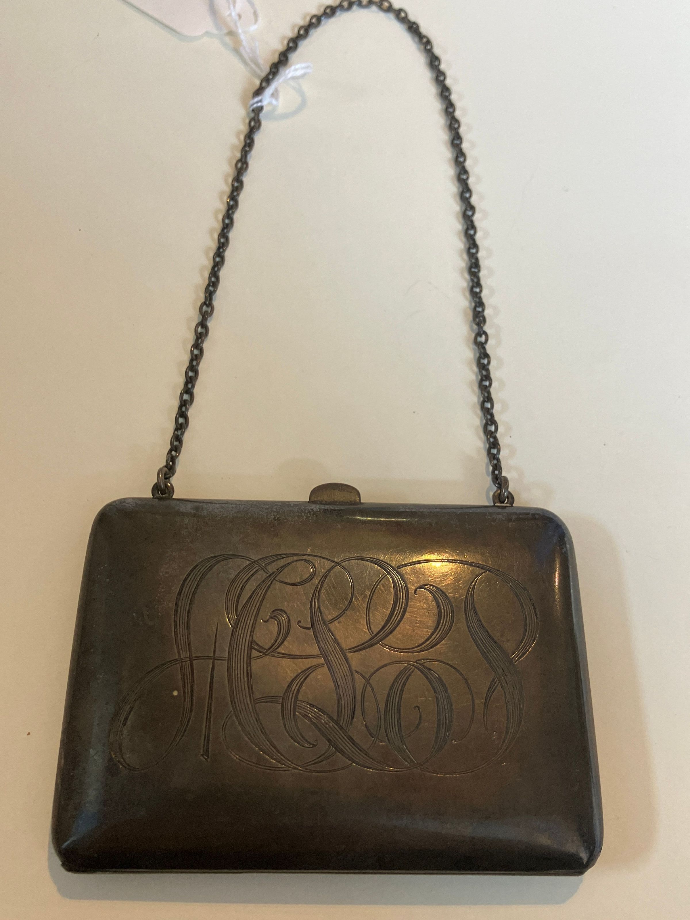 Silver card case, engraved monogram "ALP" [Alice Lavinia Pendleton 1872-1952]. Silk-lined, chain handle, several calling cards "Miss Pendleton" -- one written in pencil "with love, Alice"