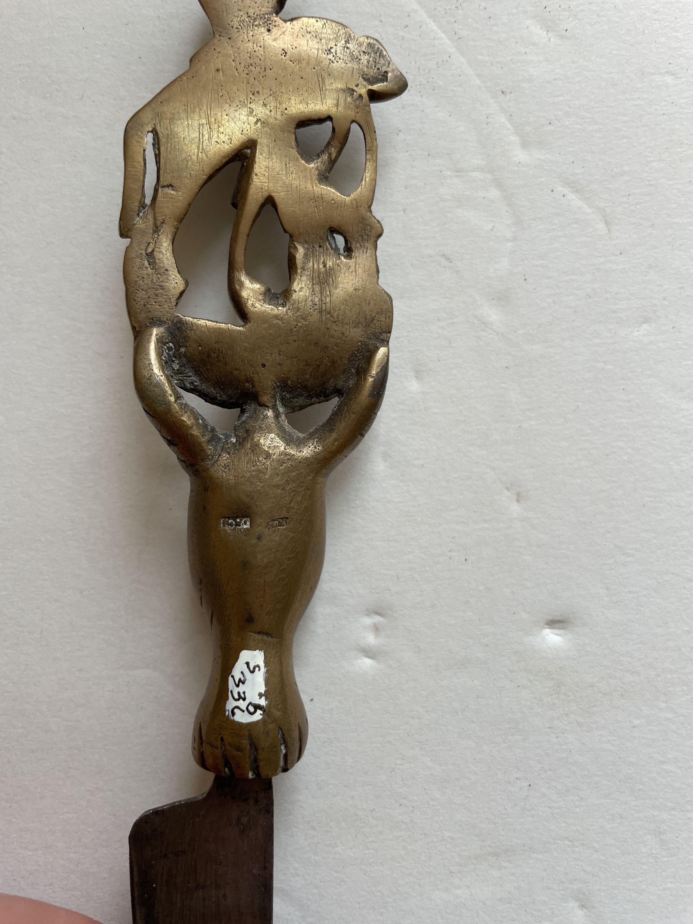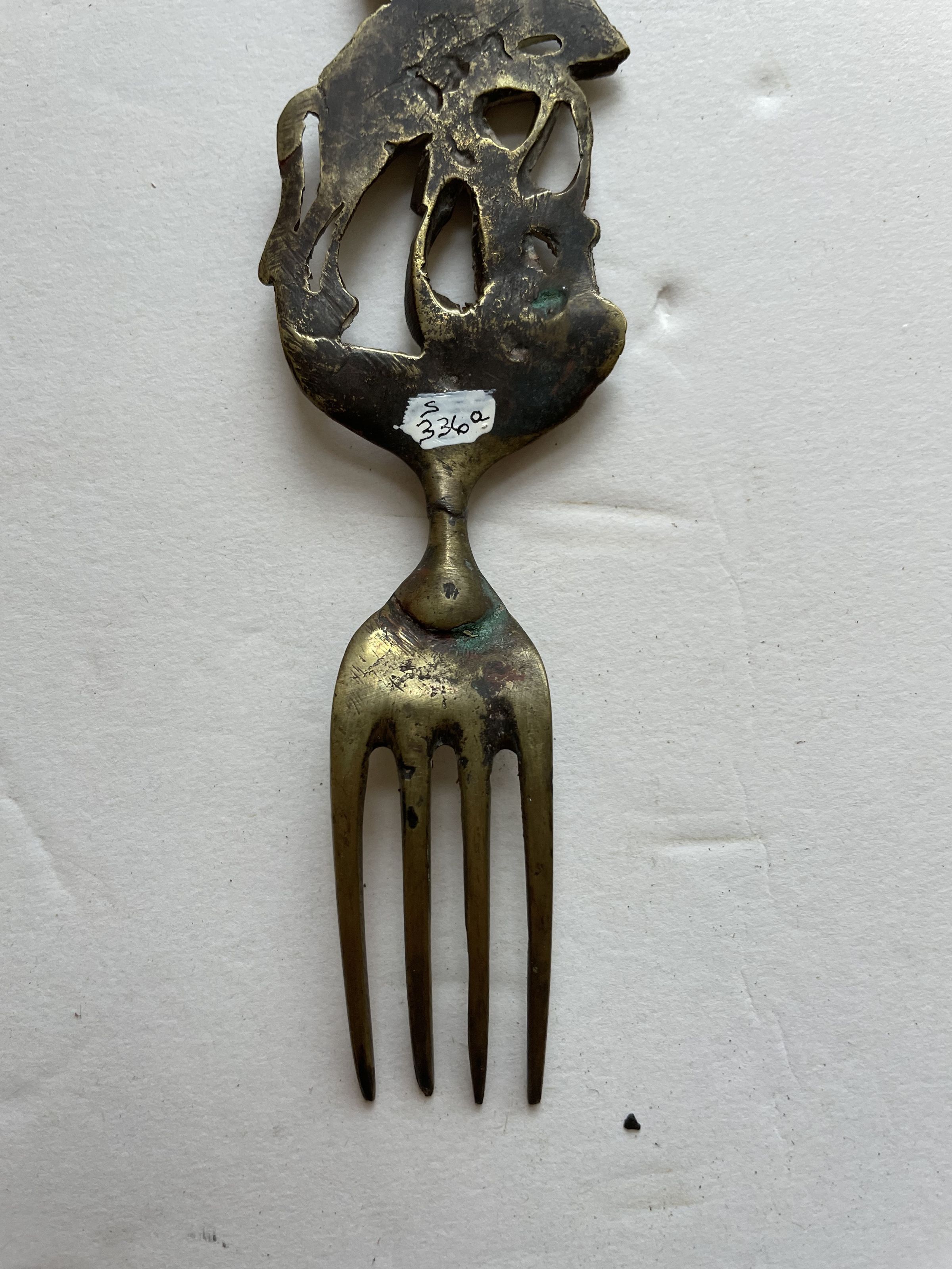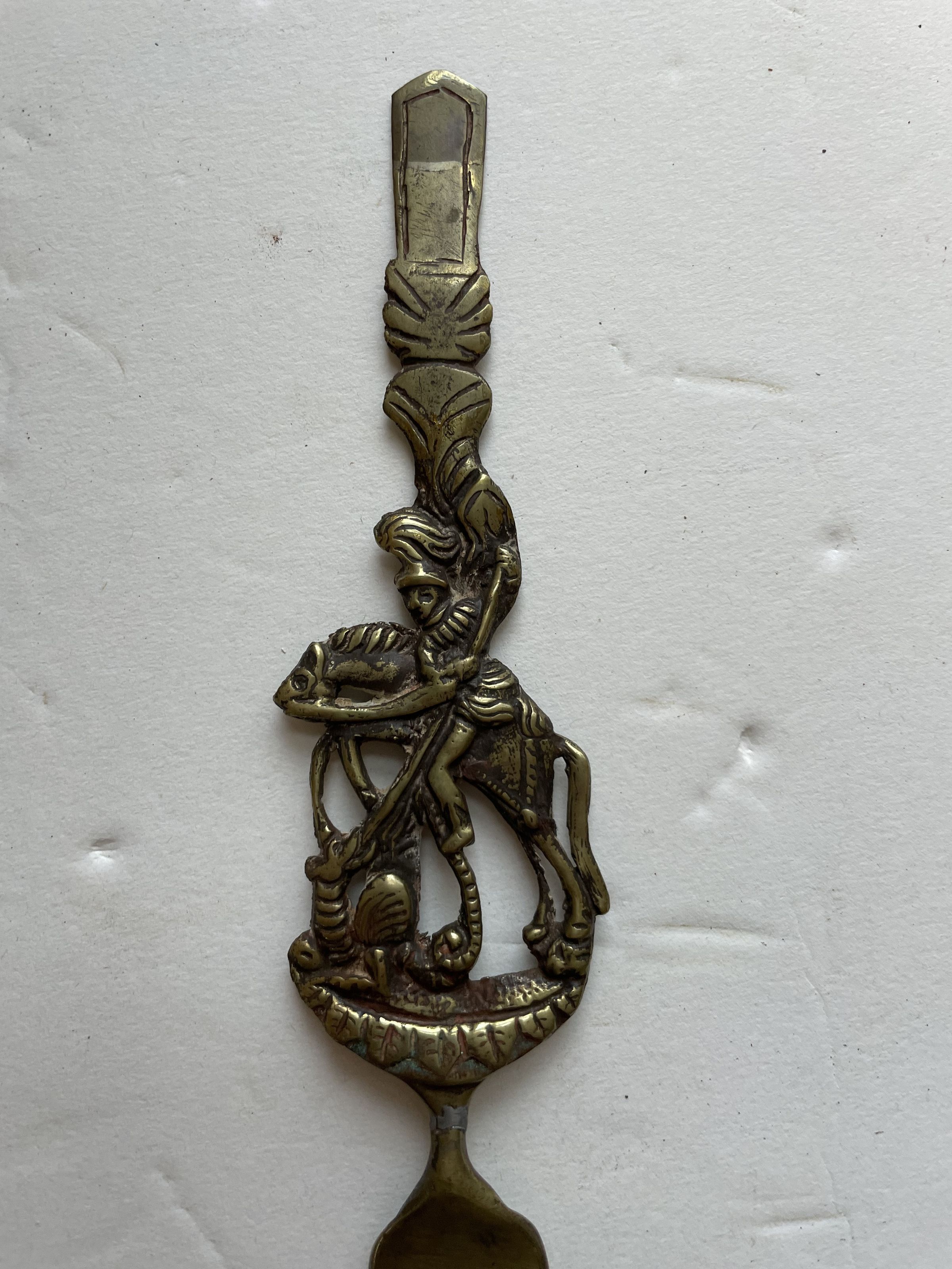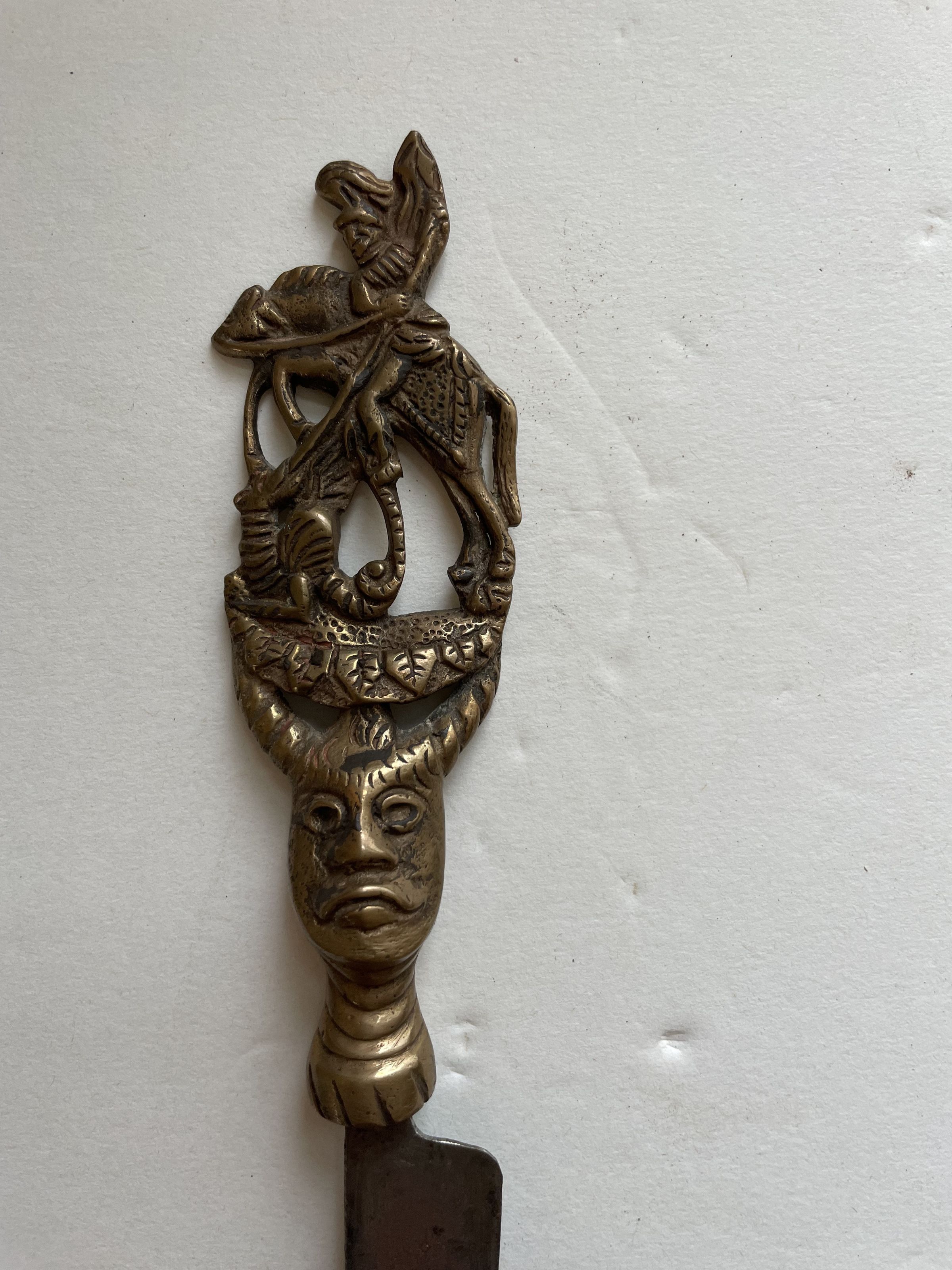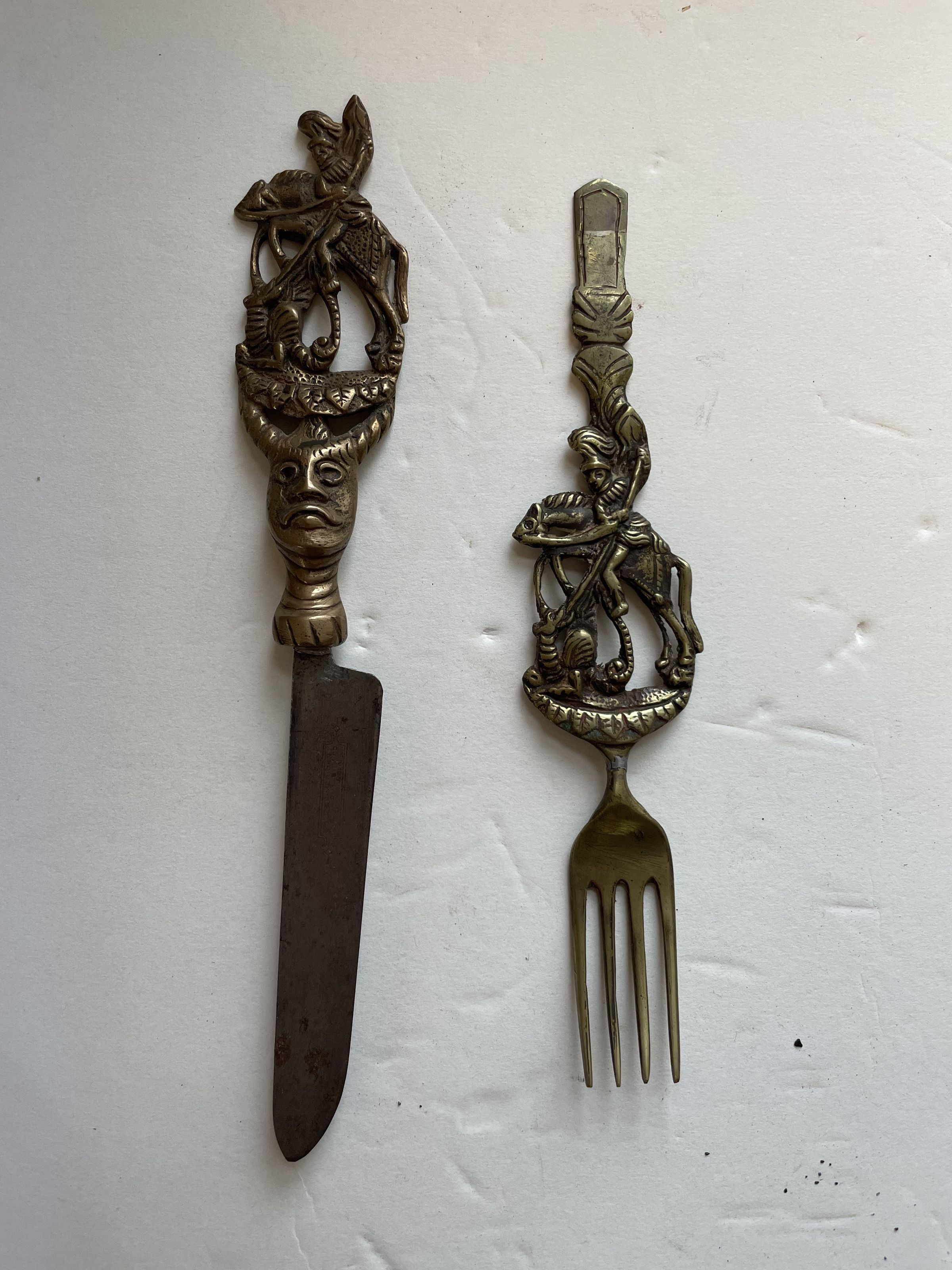 Intricately casted or carved metal knife and fork. The knife features a large face with horns, topped by a knight riding a horse and using his sword to fight against a smaller animal.