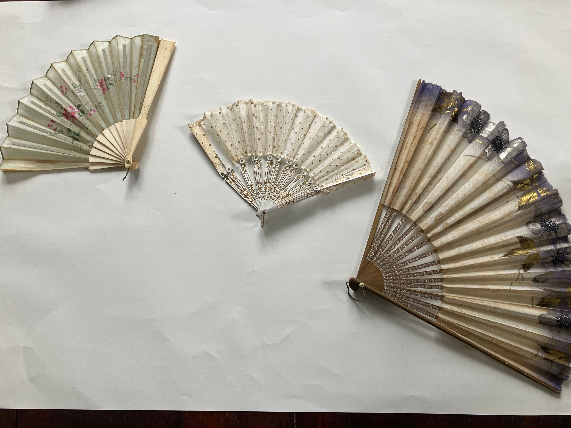 3 ladies fans: a) ivory-handles, 8" l., silk painted with flowers; b) evening fan 8" L, white with intricate gold designs, fabric silk with gold sparkles - poor condition; c) large bamboo fan 13.5", with silver design on ribs, fabric silk with painted flowers along outer edge