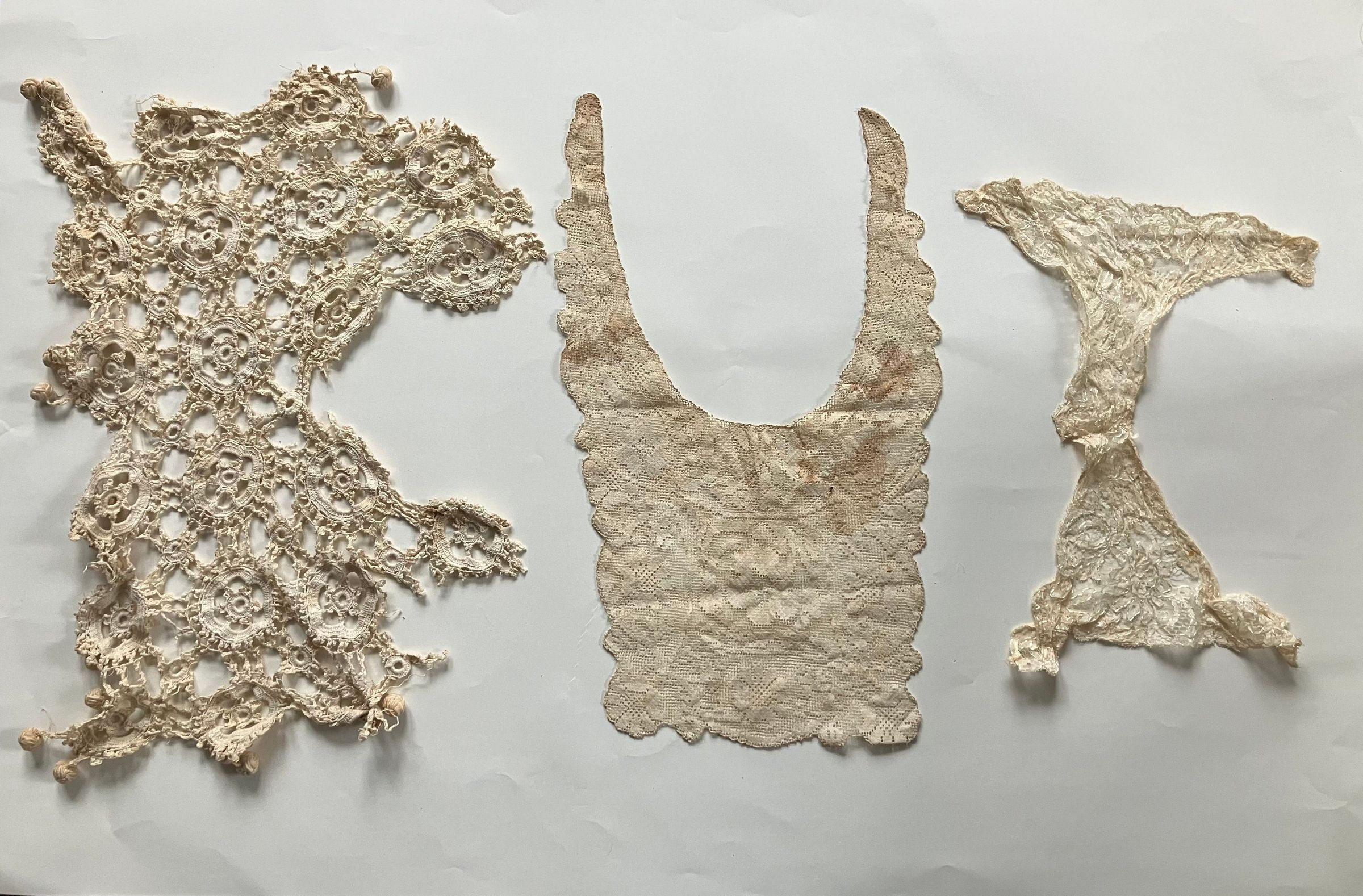 3 fichus: a) "irish lace" crocheted; b) quaker lace, design woven into a net base; c) Battenberg lace outlined with shiny silk thread. 11" square handkerchief with wide bobbin lace border, very fancy.