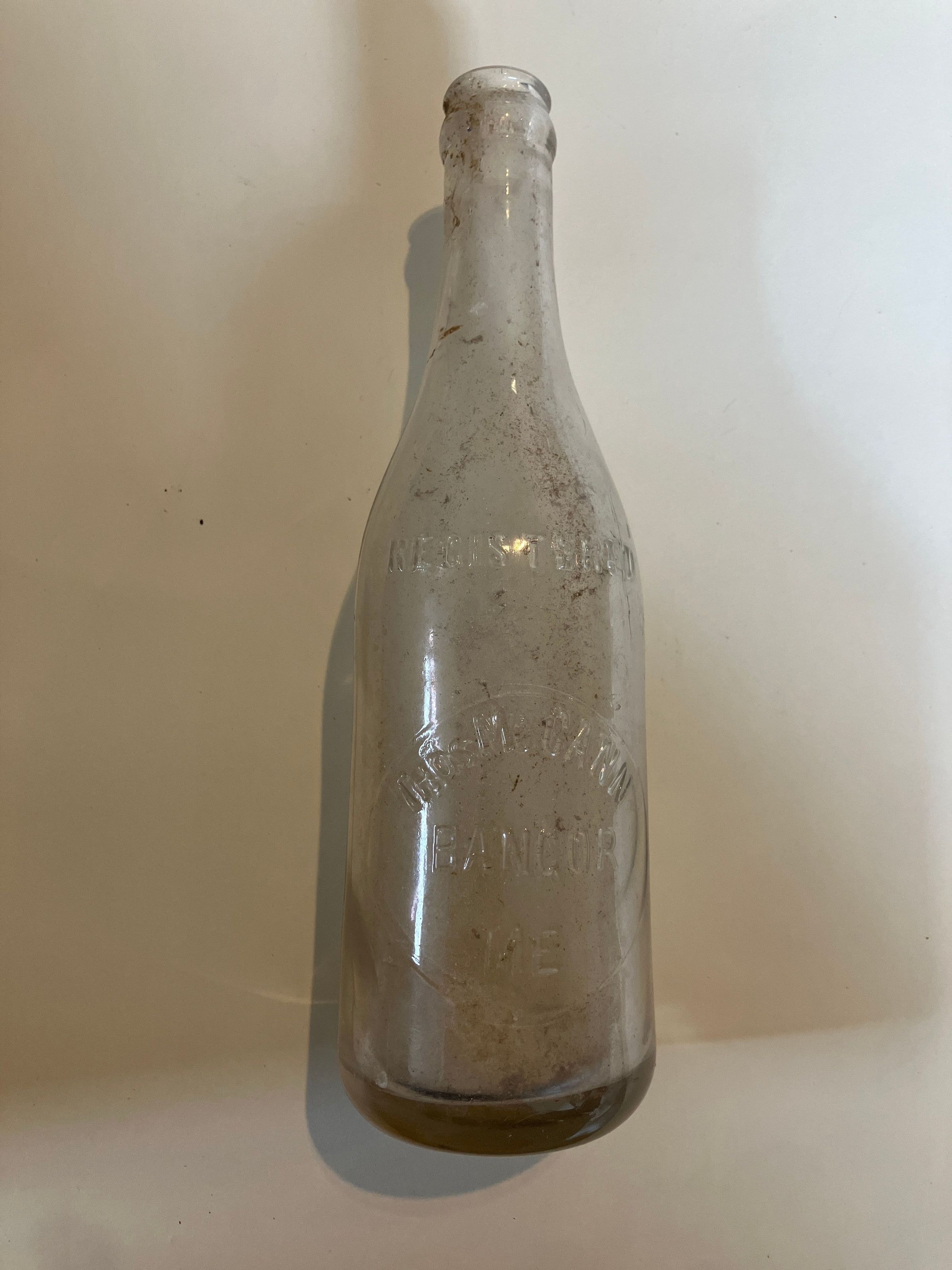 Clear glass bottle 9.5" H, "Thomas McCann, Bangor ME" Found under IHS bldg. c 2002.