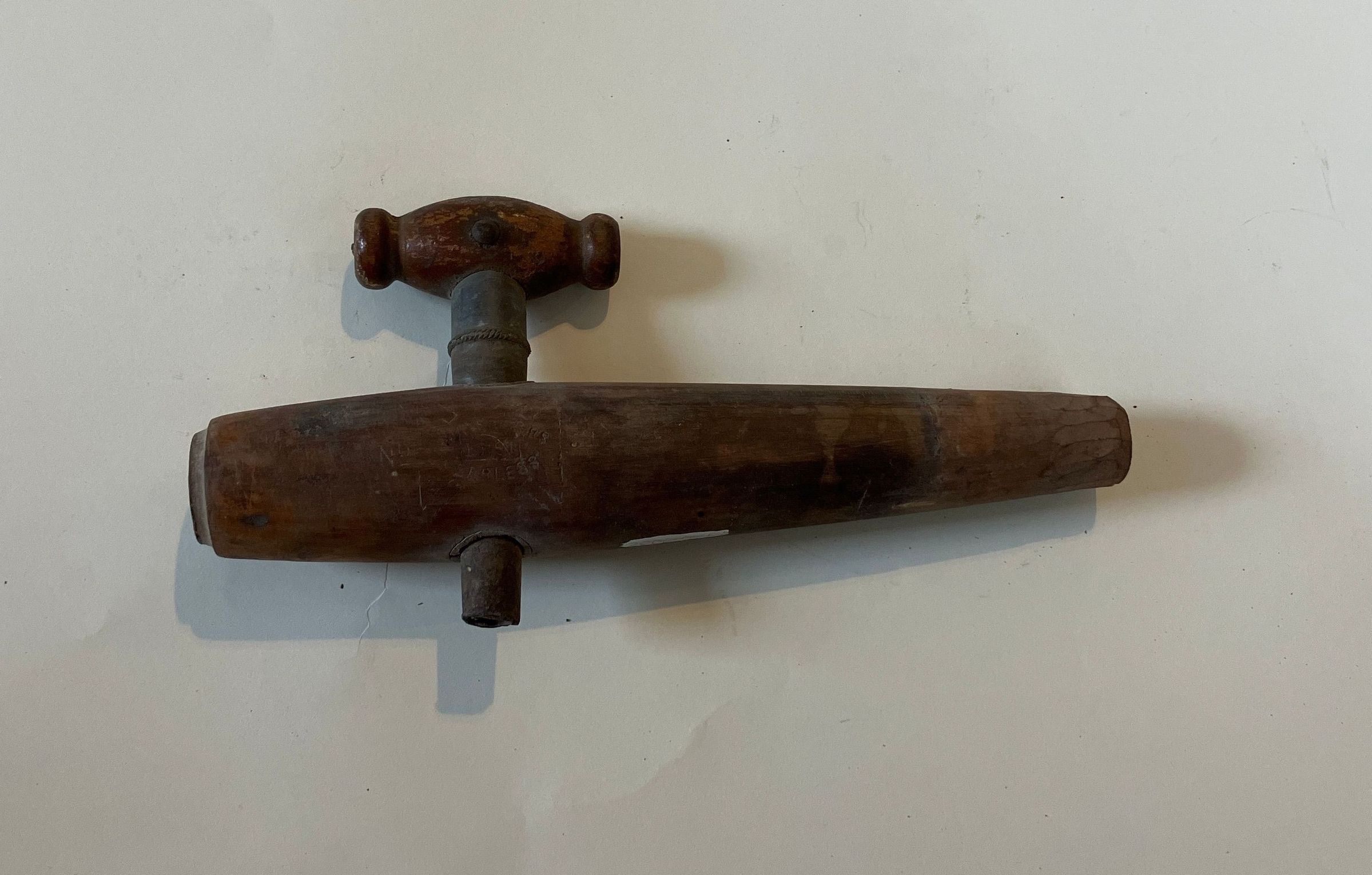 large 8 1/2" long wooden tap ("Peerless")for a barrel -- molasses or vinegar. From the Clarence G Nevels grocery store in Dark Harbor, now the site of the Paul Pendleton home..