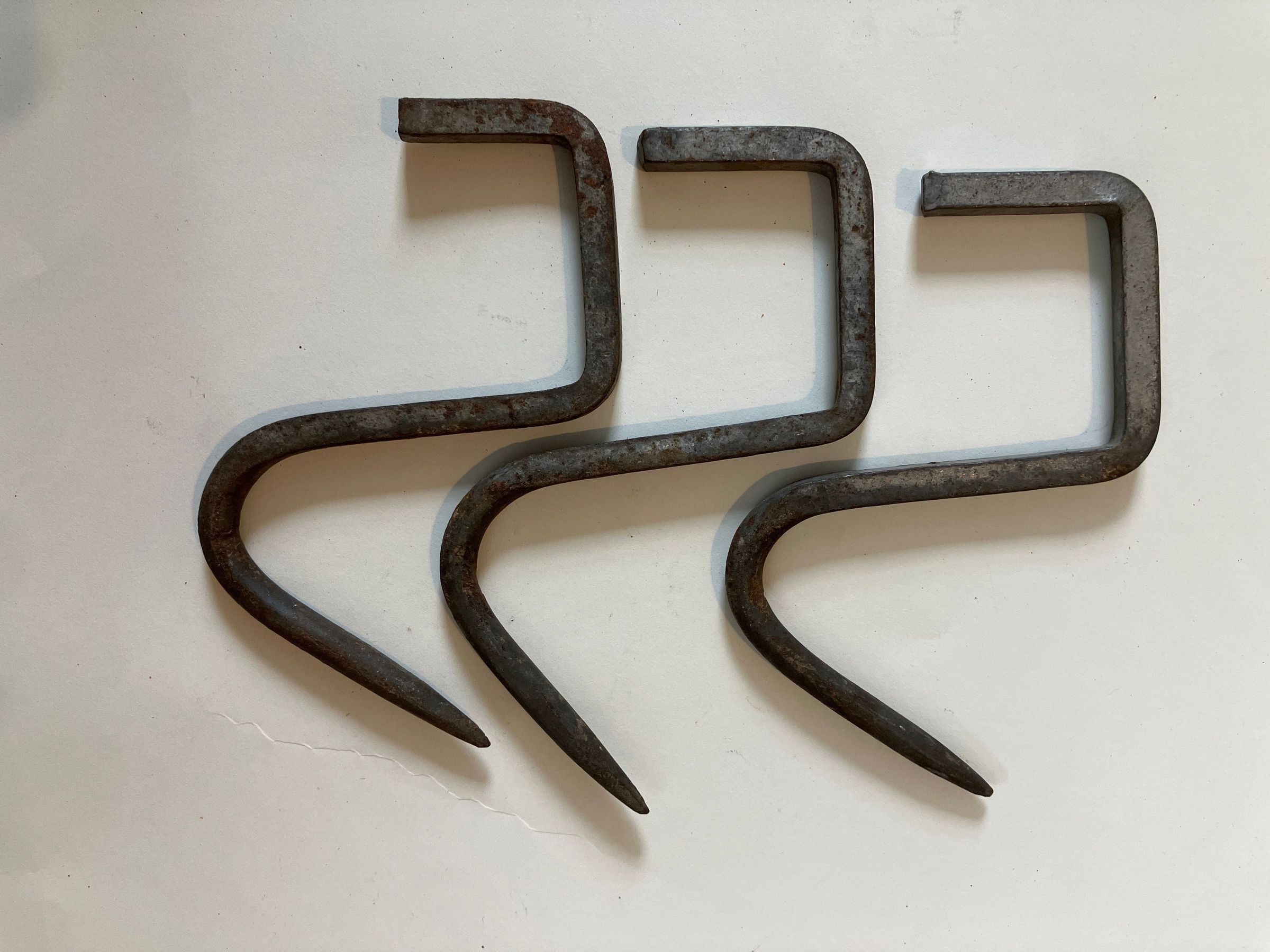 set of three small tongs for handling cakes of ice, metal, shaped like the numeral 5, the lower end sharpened. From the Clarence G Nevels grocery store in Dark Harbor, now the site of the Paul Pendleton home.