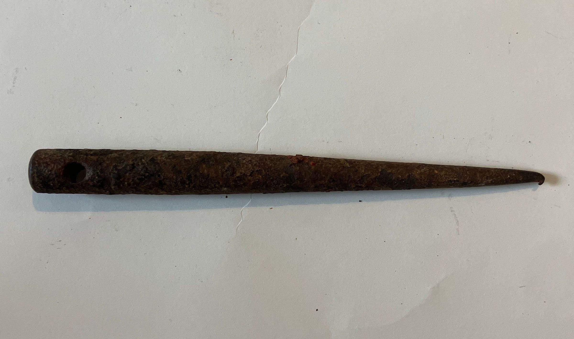 8" tapered iron weight when suspended by a cord will indicate a true vertical. Used by both masons and carpenters. From the Clarence G Nevels grocery store in Dark Harbor, now the site of the Paul Pendleton home.