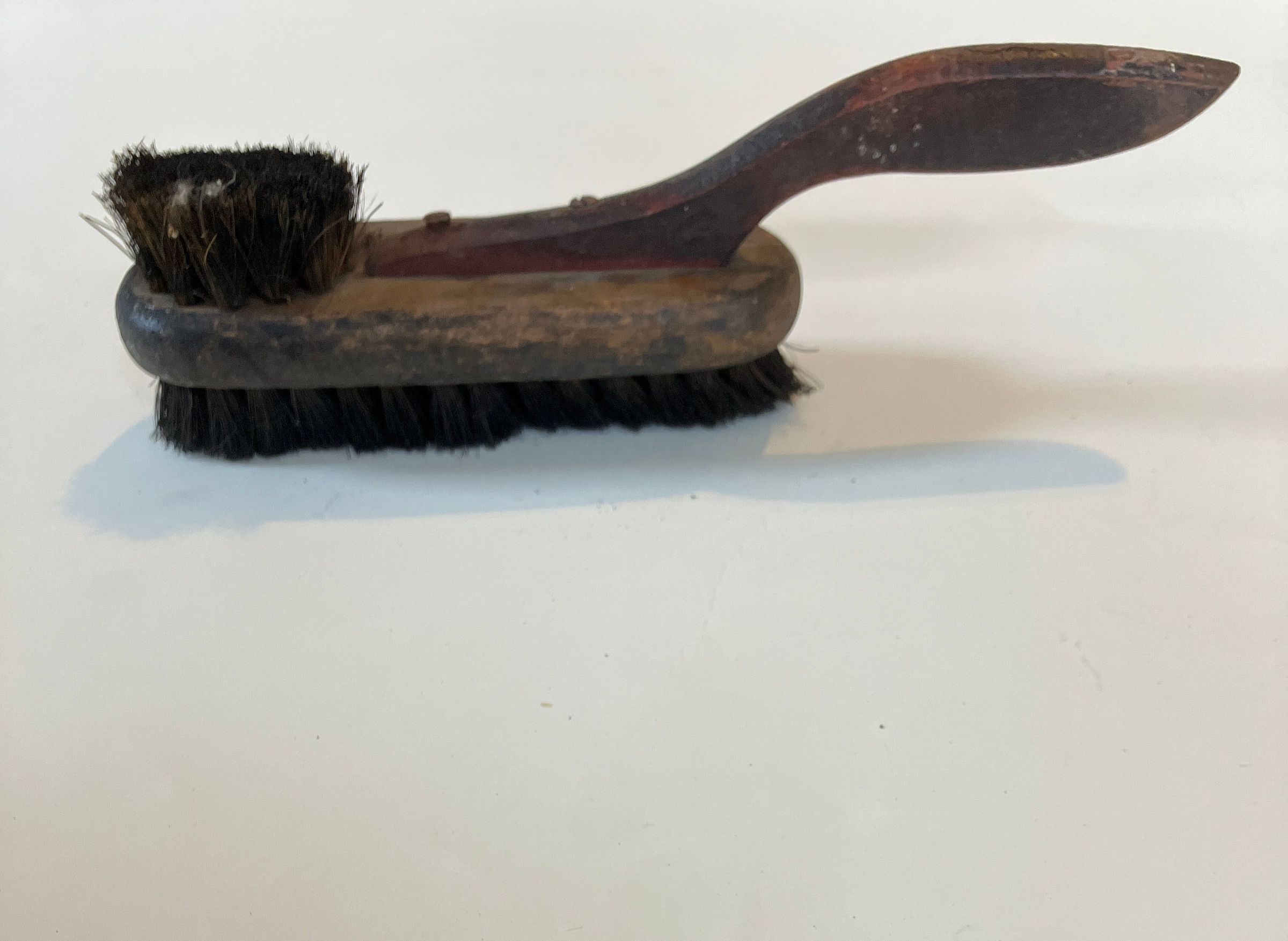 11" long wood and bristle shoe brush with applicator and polisher. From the Clarence G Nevels grocery store in Dark Harbor, now the site of the Paul Pendleton home.