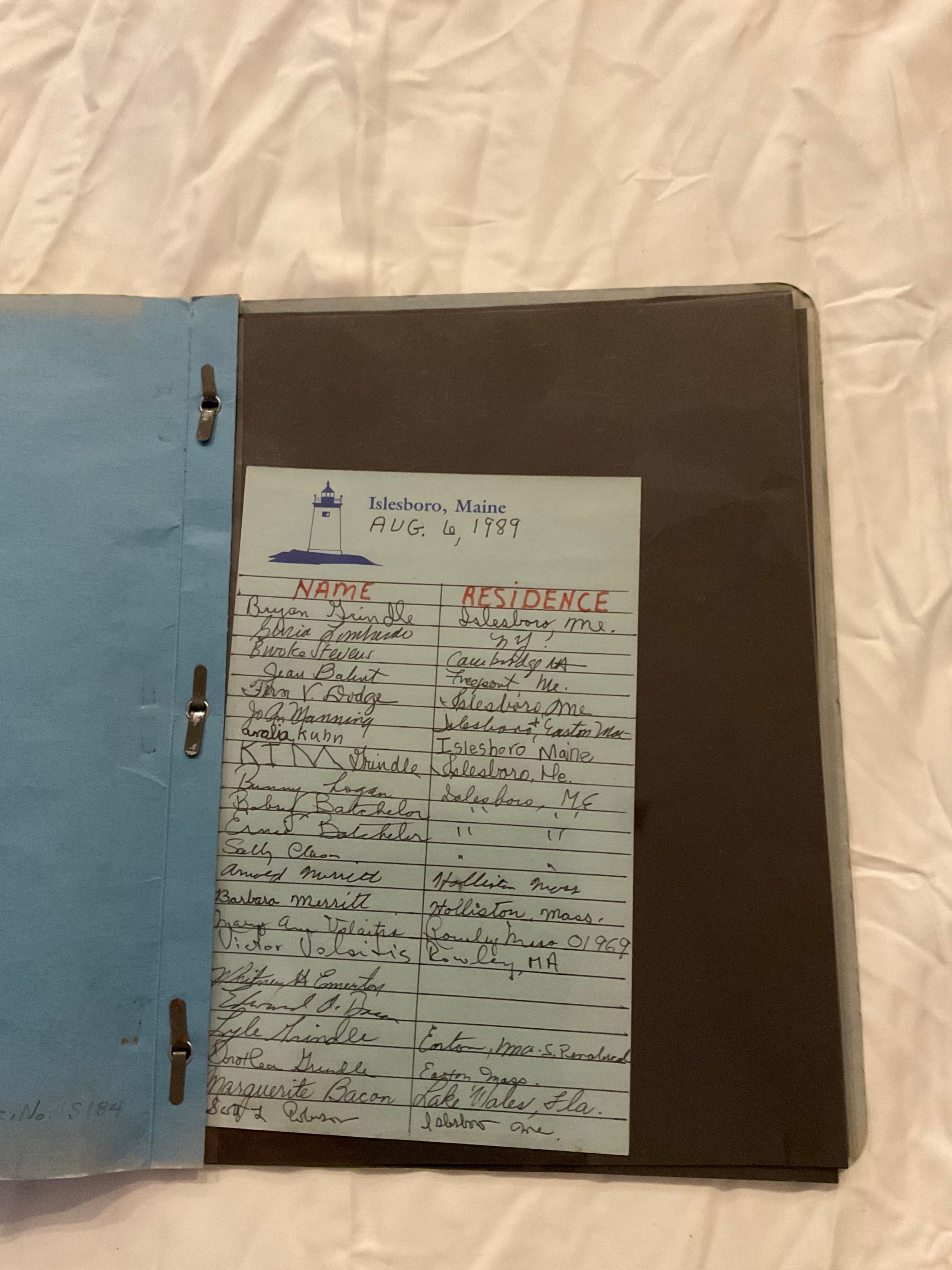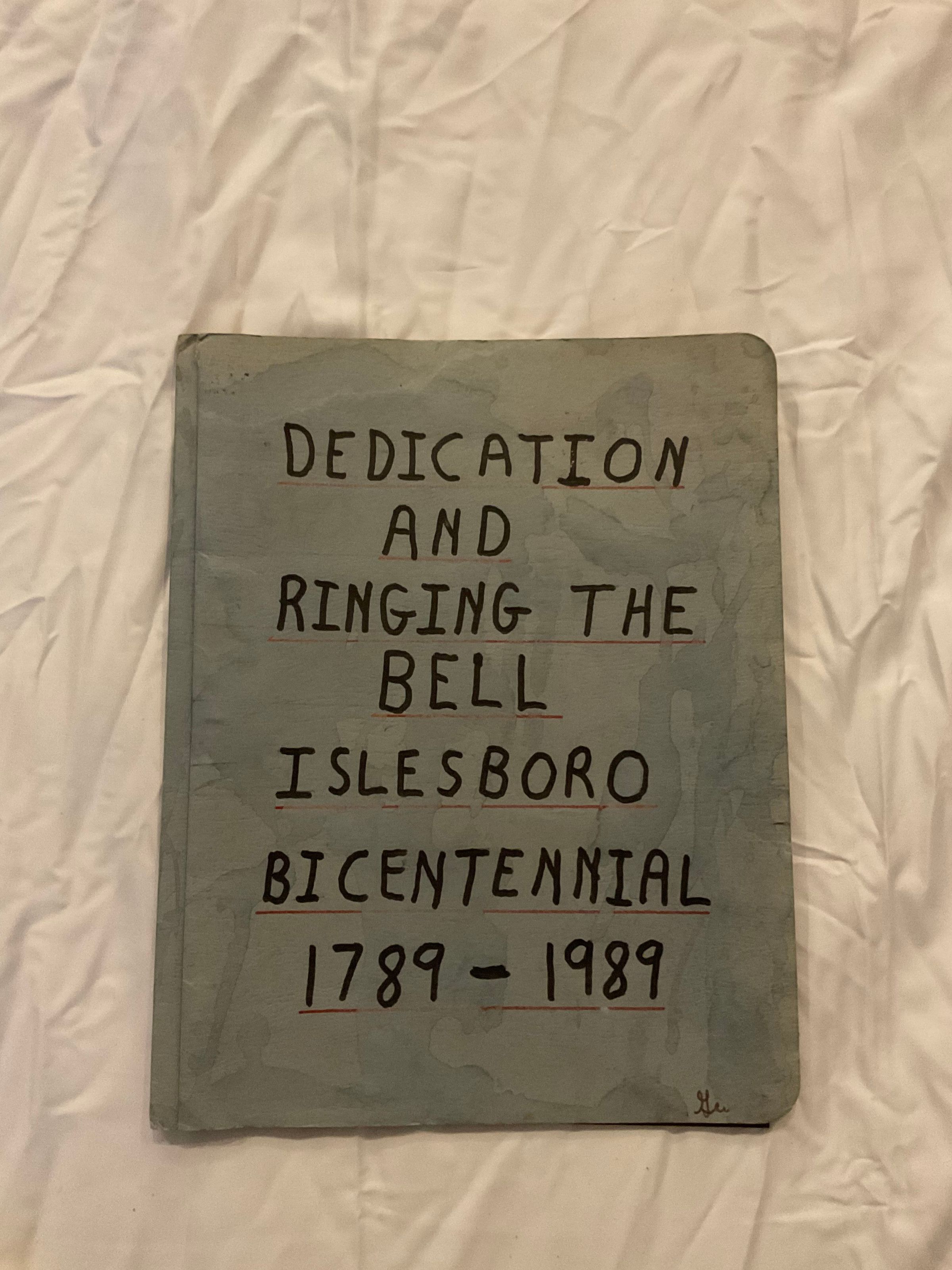 A blue folder that features a hand written title, written in black marker, “Dedication and ringing of the bell Islesboro Bicentennial“. The book features a series of cards where visitors have signed their names and where they are visiting from.