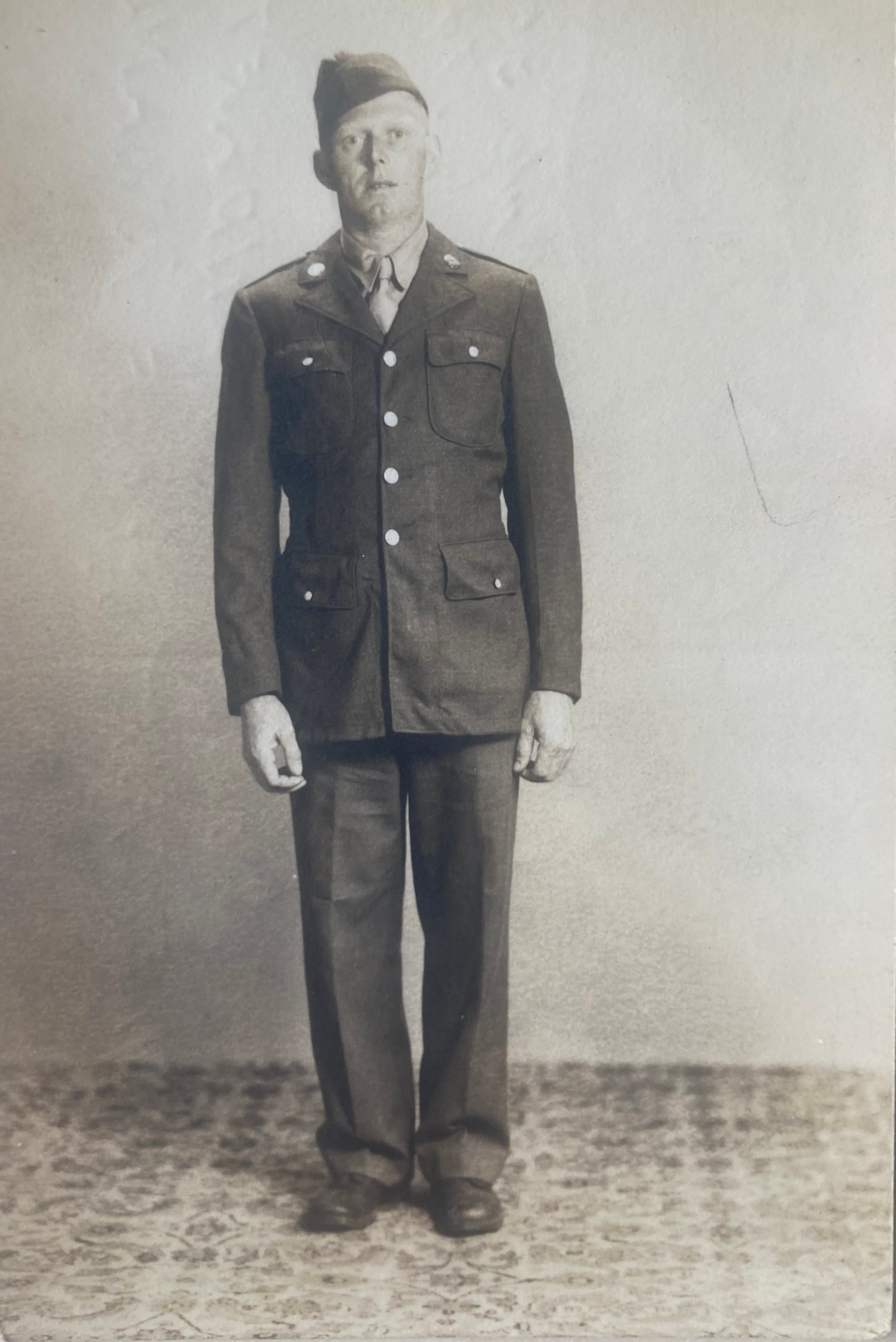 Black/white postcard photograph of Lorimer Randlett. Note on back: To my love, Mary Jane Bridges. July 30,1942. Pvt. Lorimer E. Randlett, Newport Rhode Island.