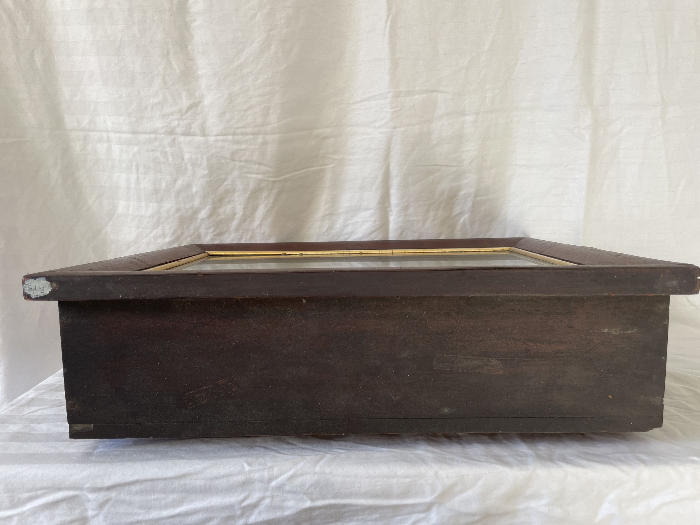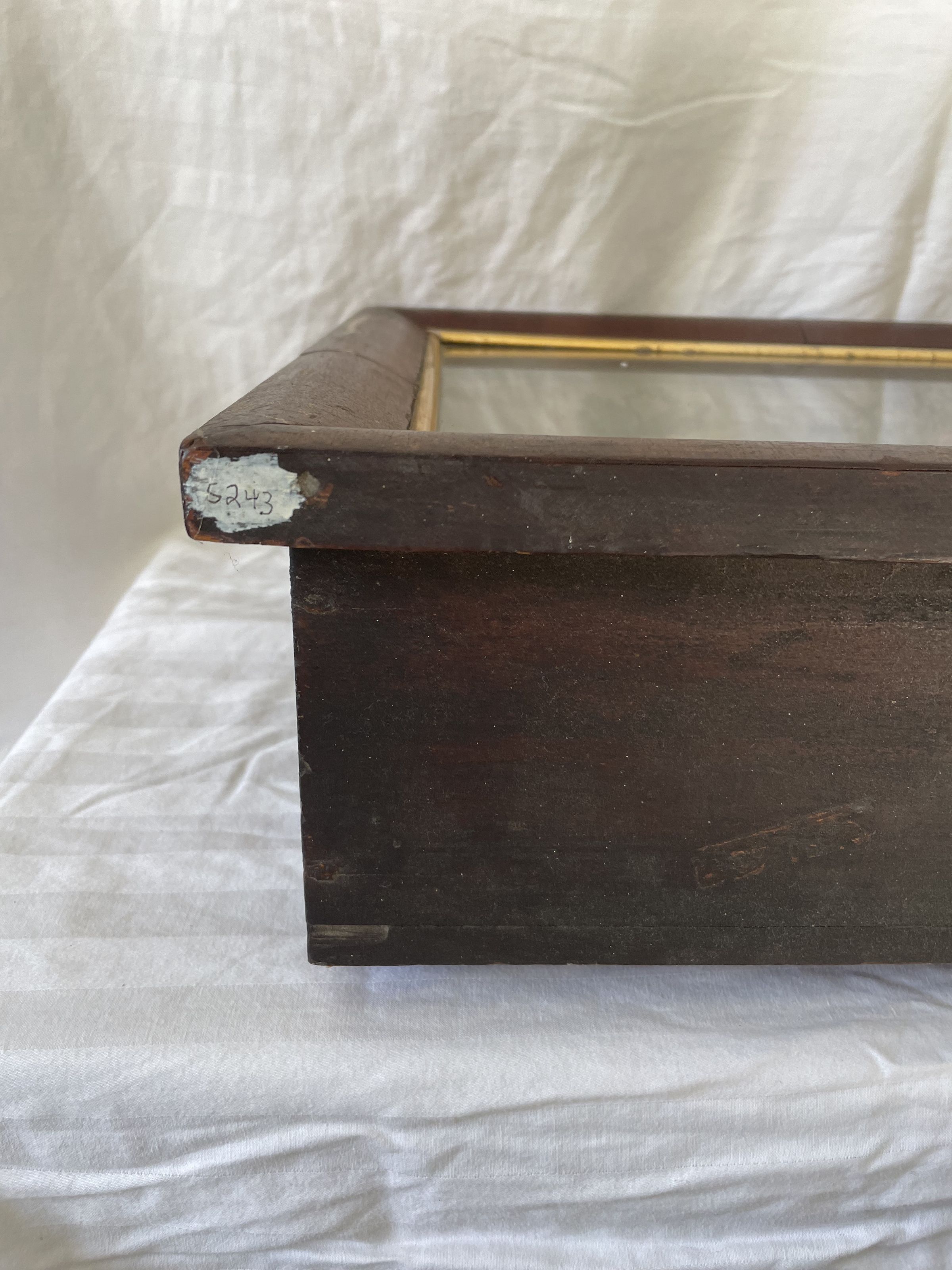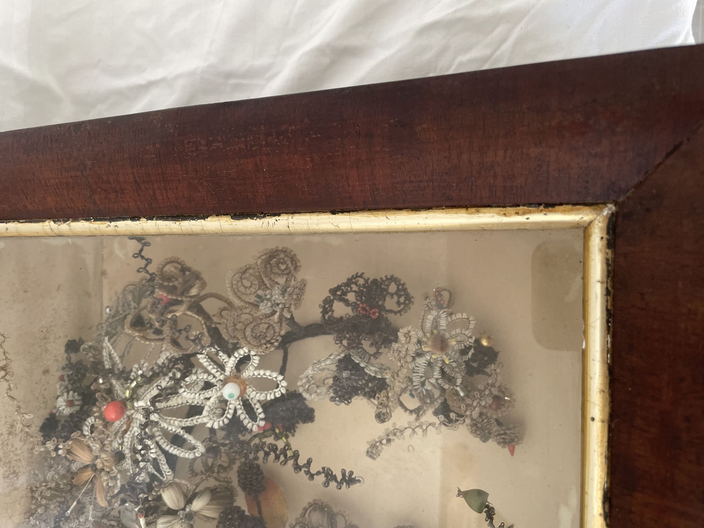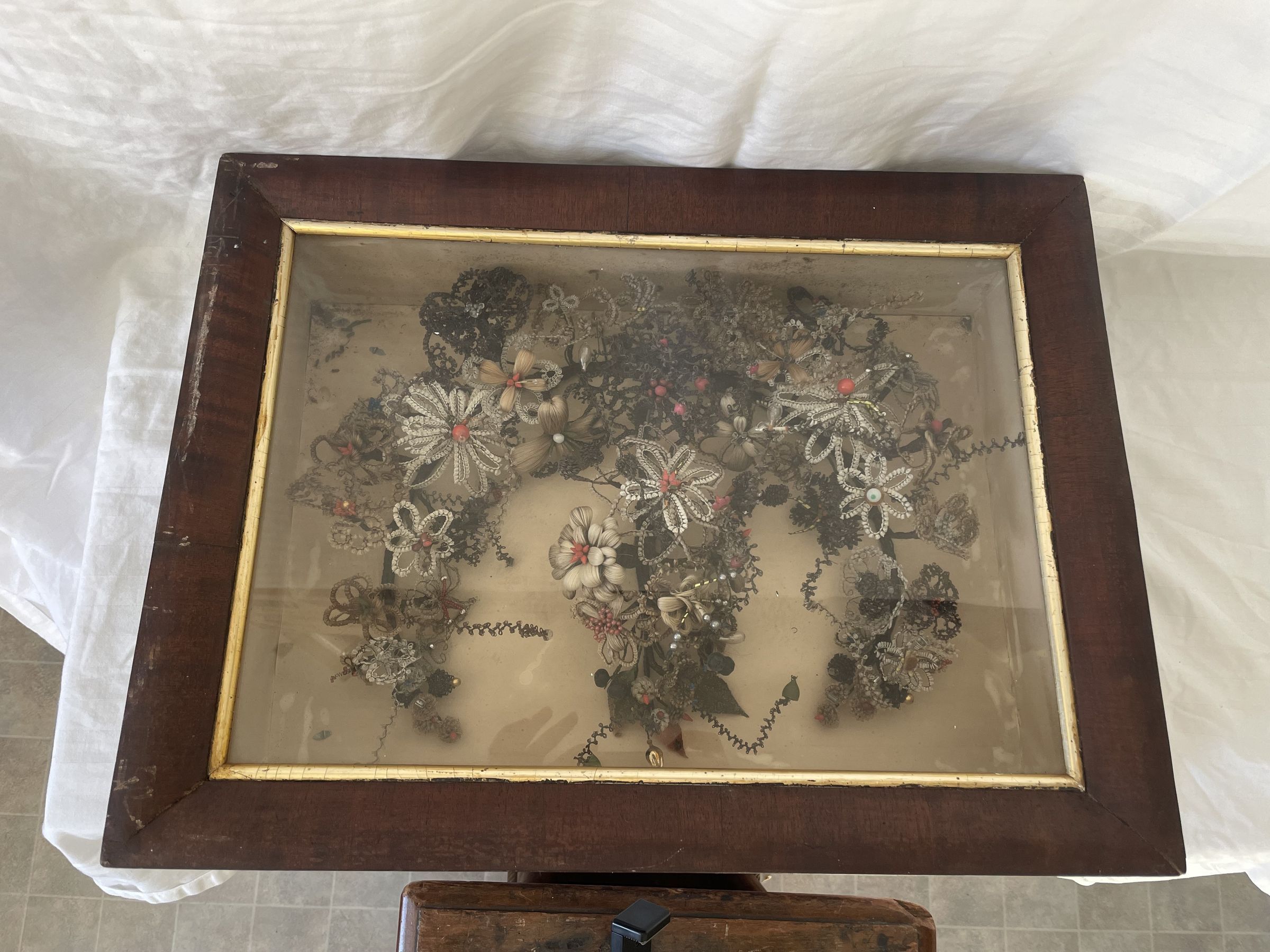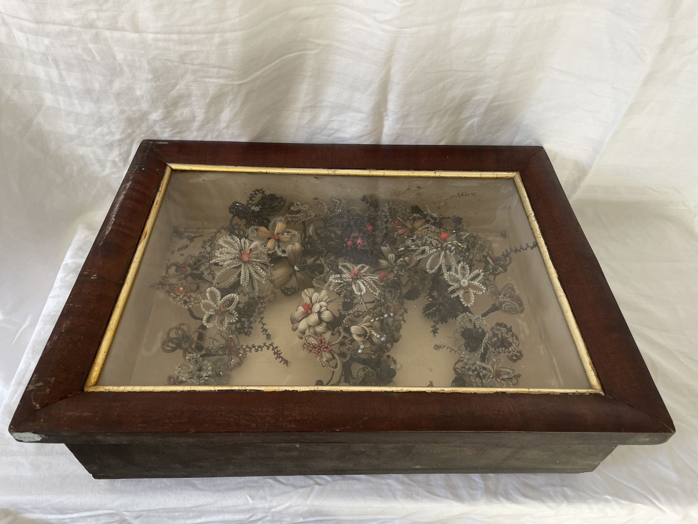 Wooden box with top window and gold painted trim. The hair wreath contains three prongs of flowers, beads, and woven human hair of various colors. S243