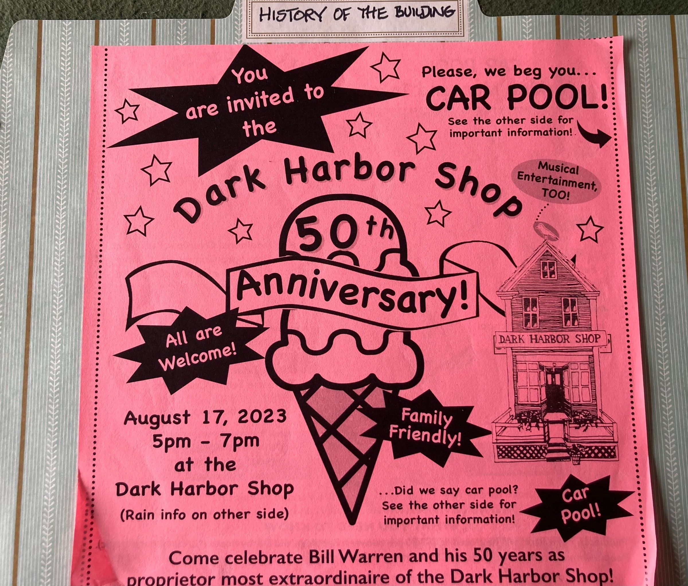 Foldout commemorative album showing in four enlarged photographs the history of the building that is home to the Dark Harbor Shop. Created in honor of the 50th Anniversary celebration of the Dark Harbor Shop, August 17, 2023.
