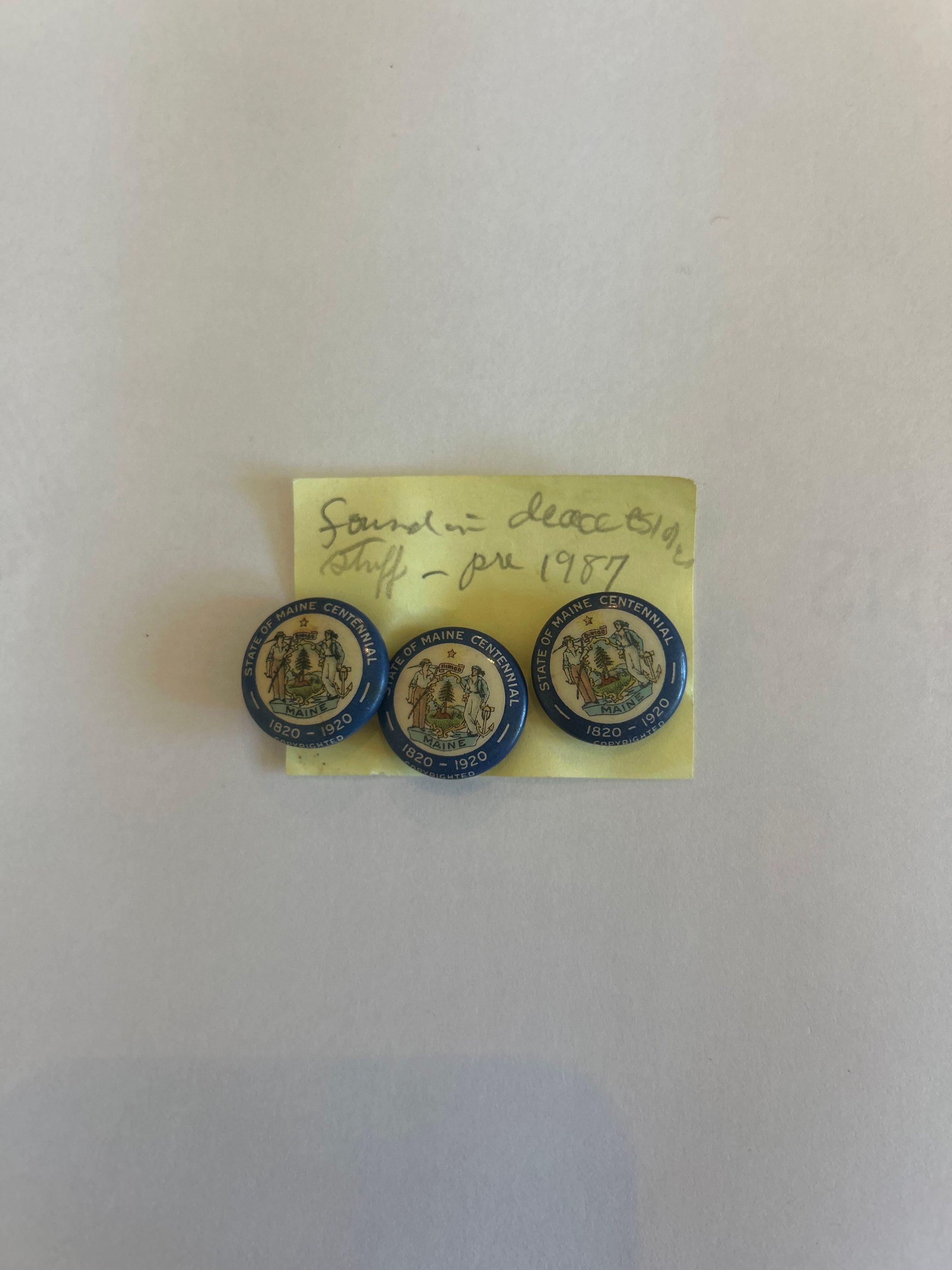 3/4" diameter lapel pin commemorating the centennial of statehood of Maine. Center with seal of the State on a white background, surrounded by a blue band with printing "State of Maine Centennial -- 1820-1920"