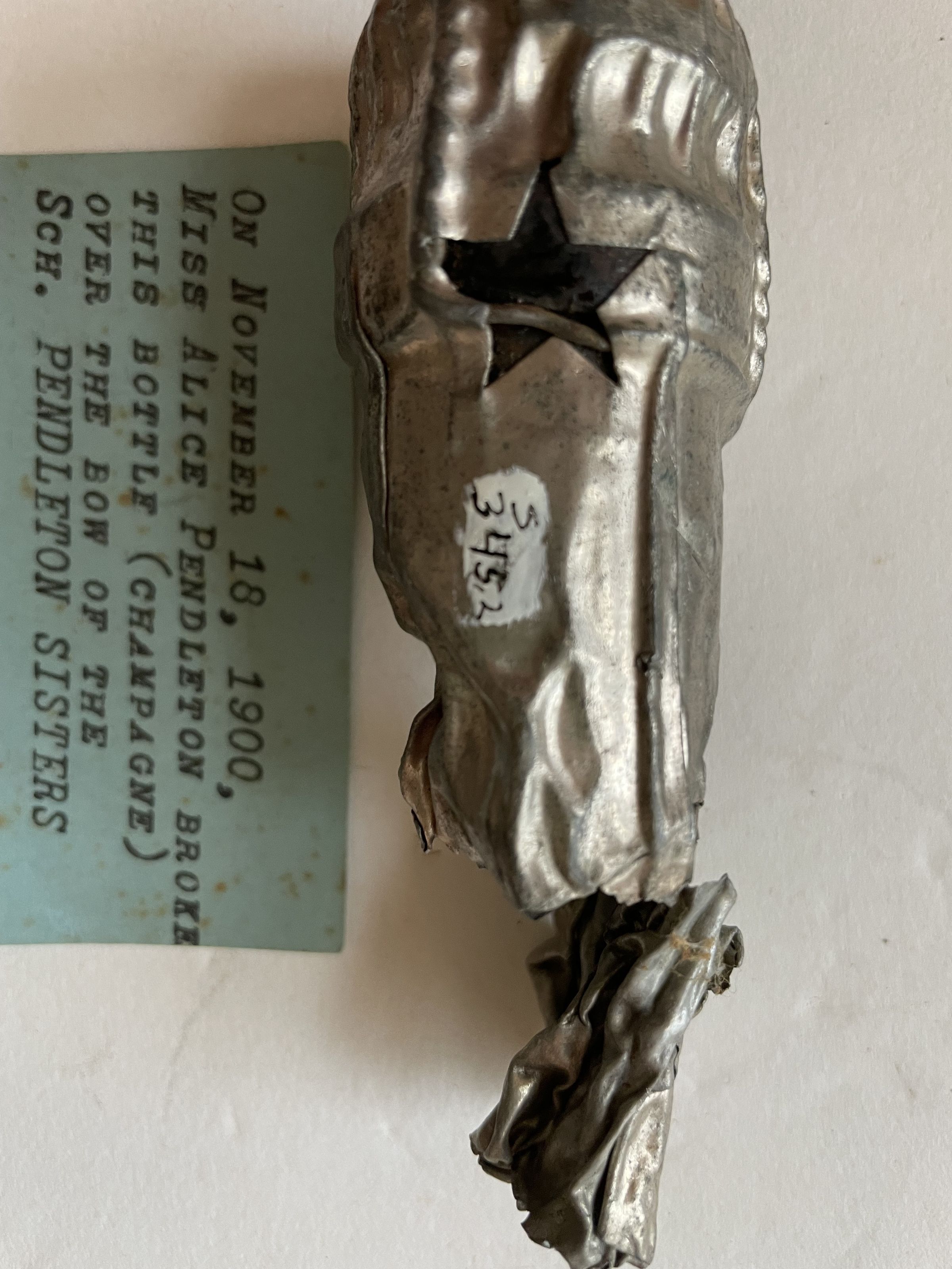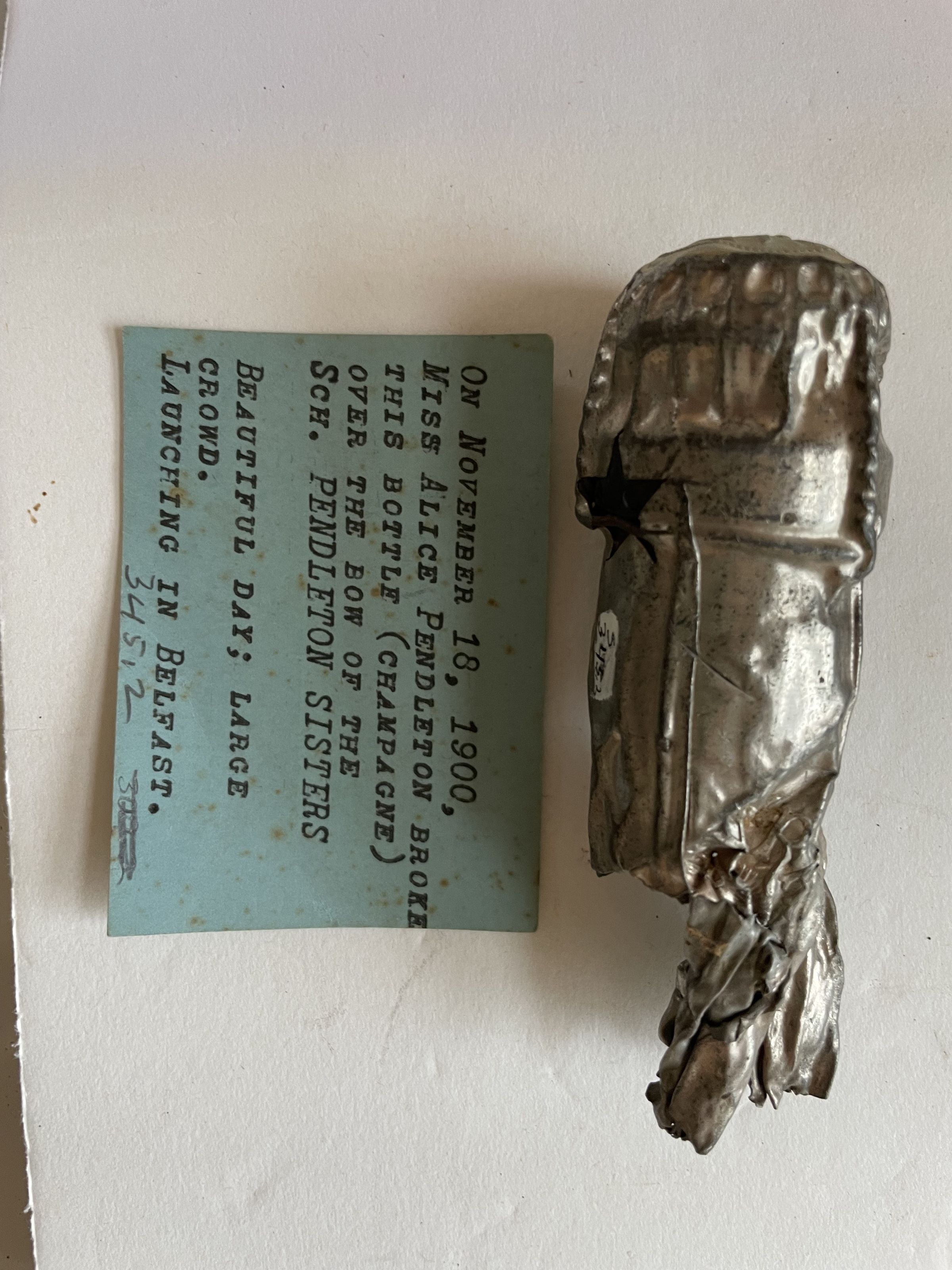 The head of a champagne bottle broken over the schooner Pendleton Sisters at the splashing celebration. The bottle was broken over the bow by Miss Alice Pendleton on November 18th, 1900 in Belfast in front of a large crowd