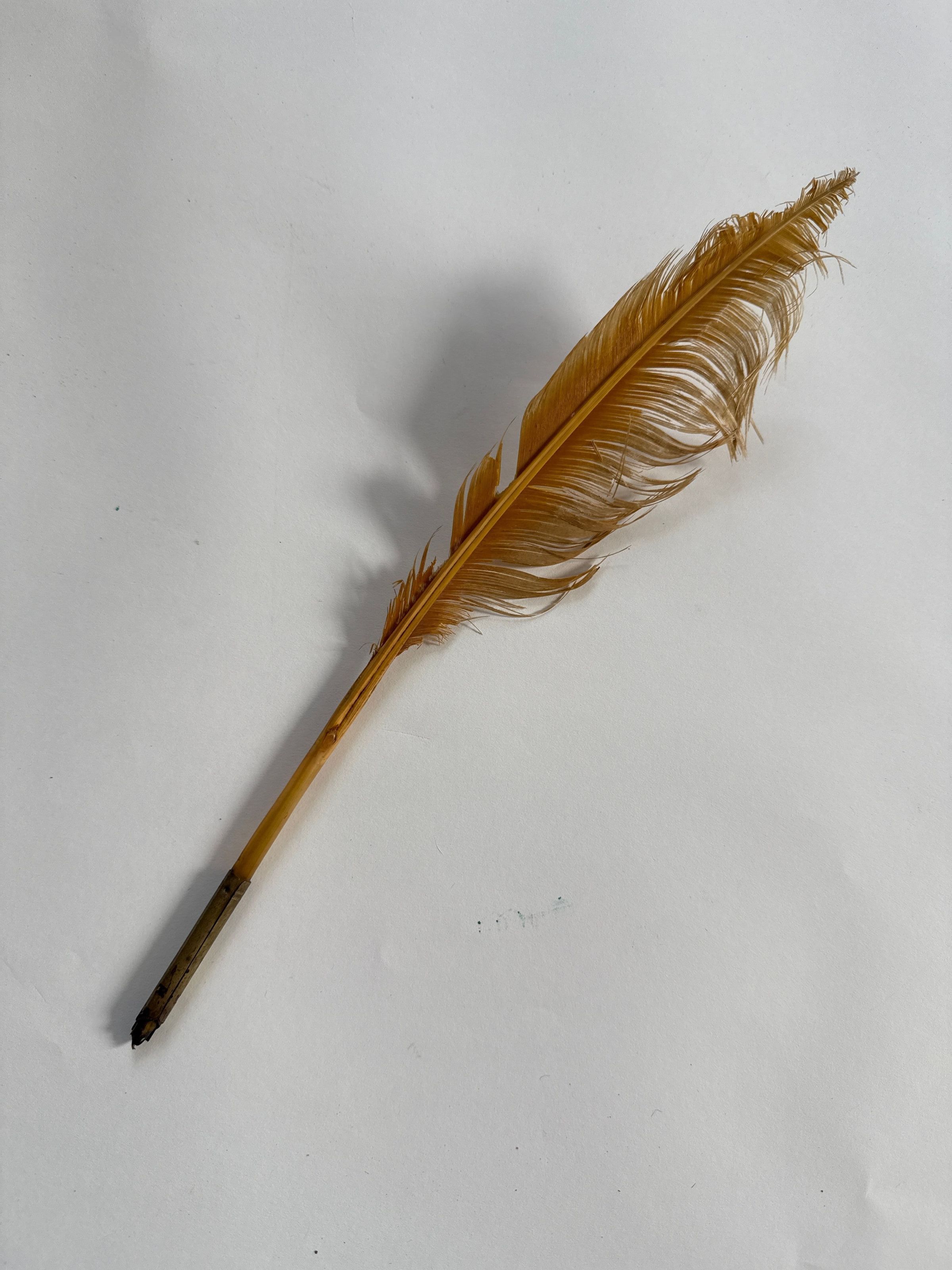 Quill pen 13.5" long, 2.25 inches at the base bound in brass.