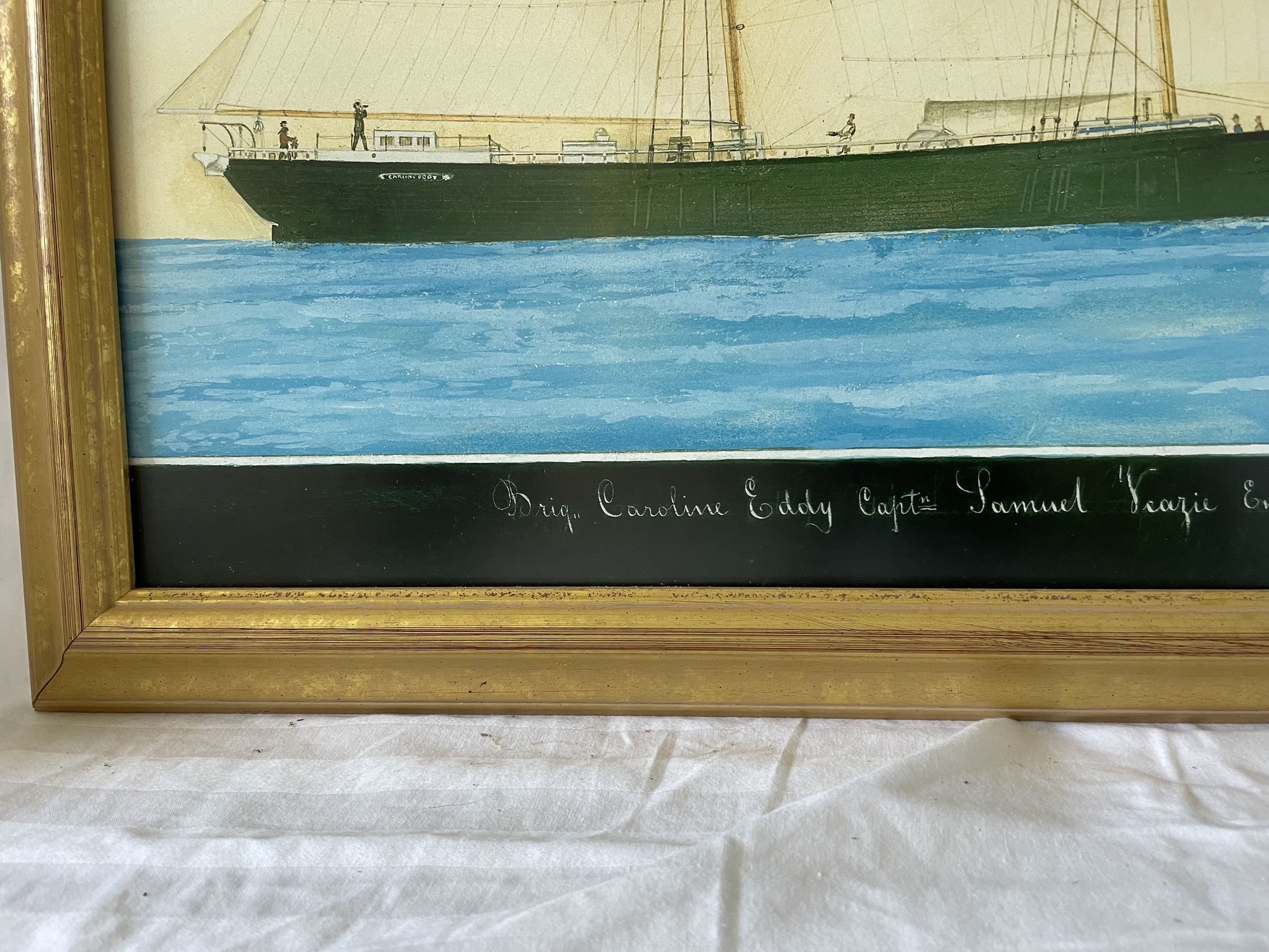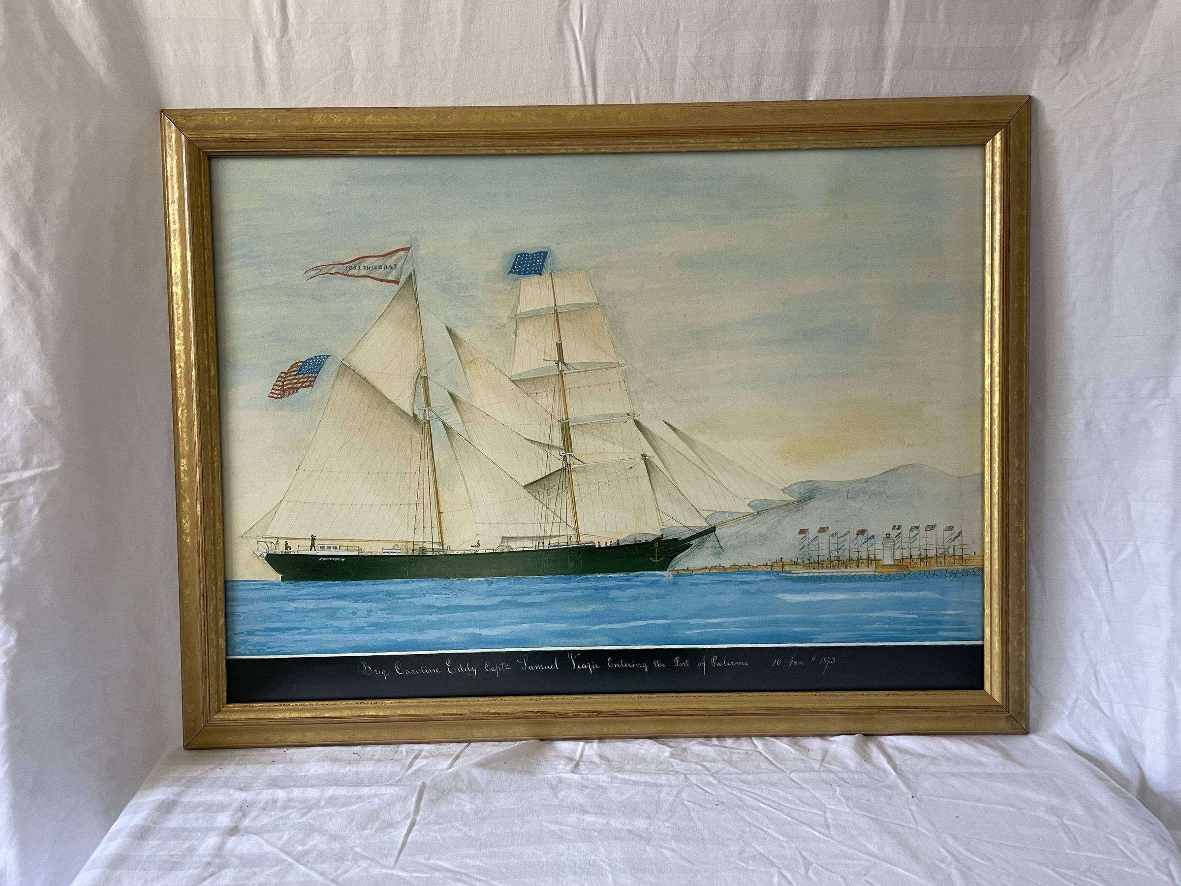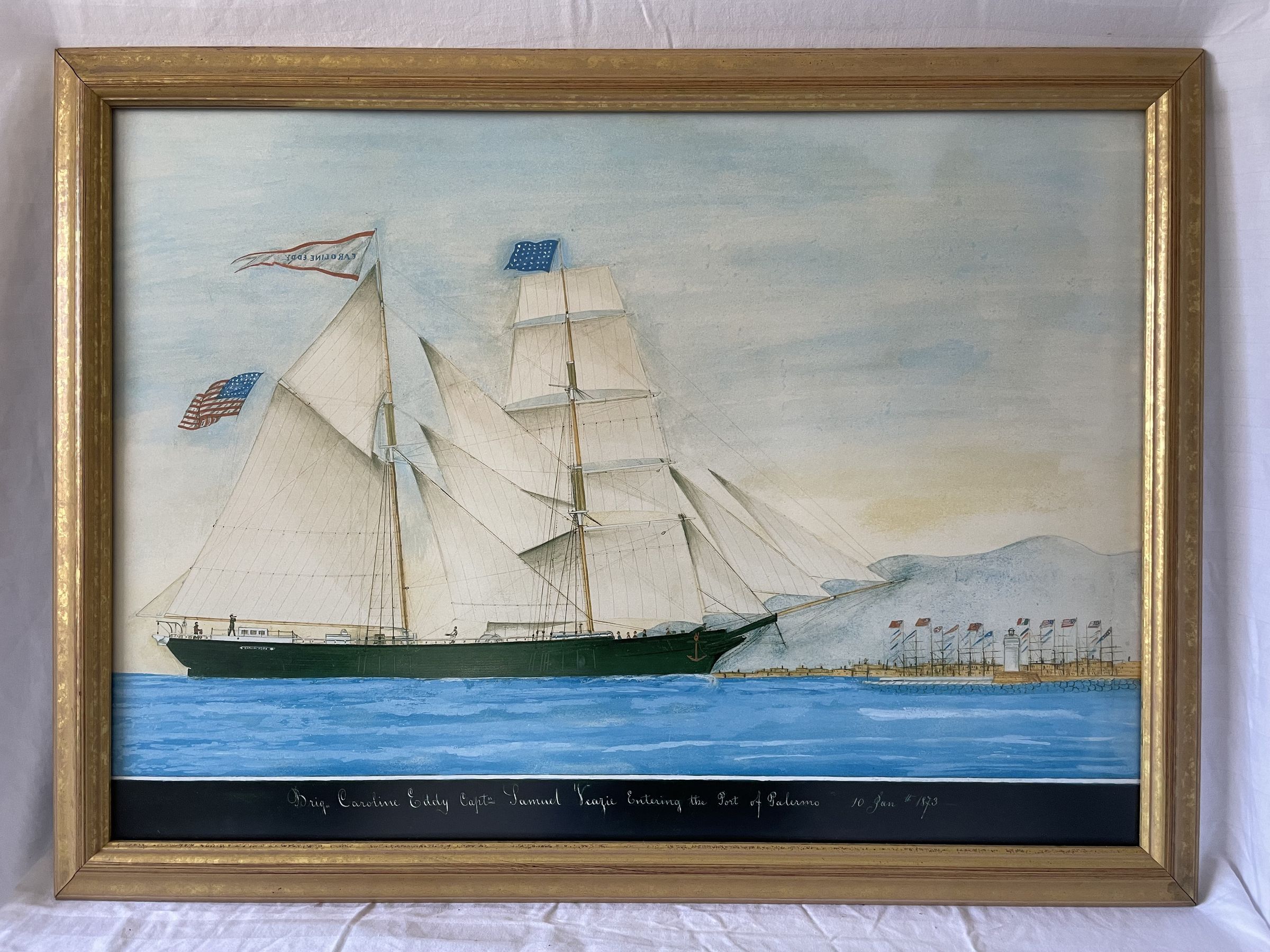 Reproduction of a painting of the brig the "Caroline Eddy". Captain Samuel Veazie entering the port of Palermo.
