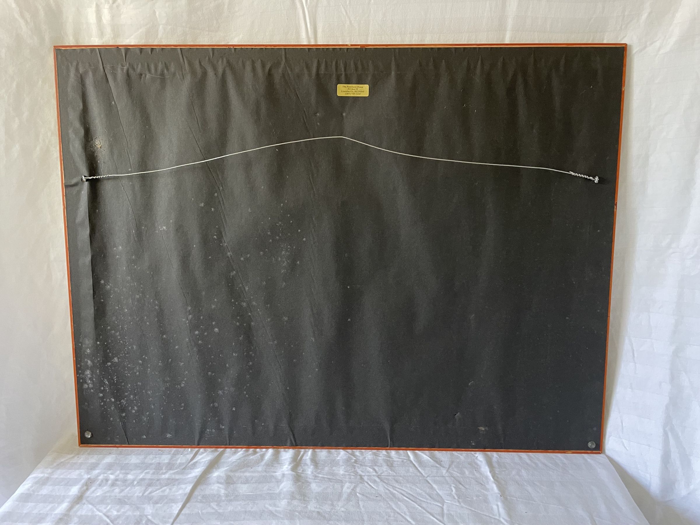Two mast schooner with all sails up, including 3 front jibs. Green haul and white sails, with three sails (one of which is an American Flag). Framed in a wooden frame with bright gold paint. Black stripe at the bottom of the painting gives context to the paintng. 1873.