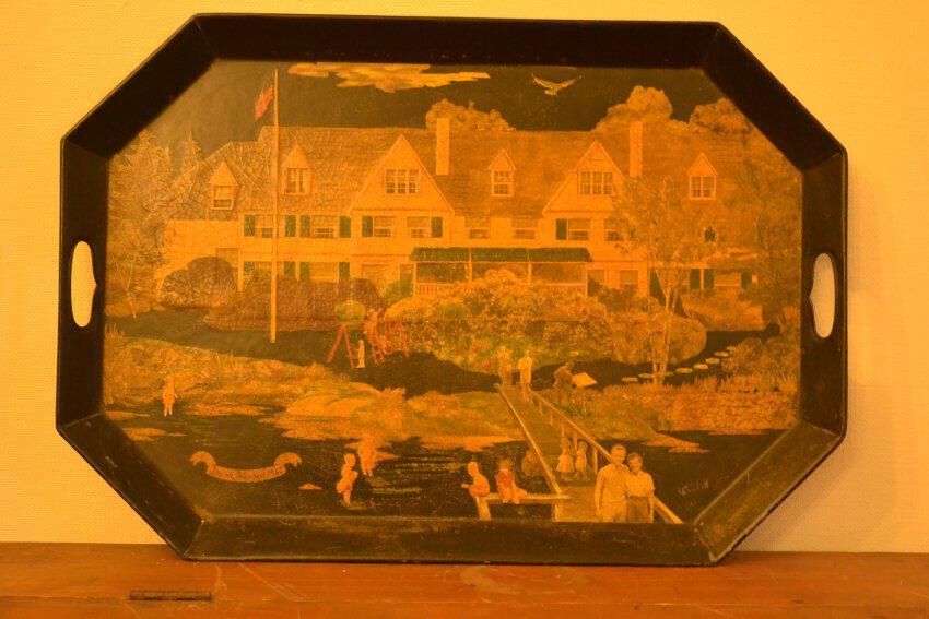 large metal tray, c 24" x 18" hexagonal, painted and decoupaged with photo images of the Aldrich Dark Harbor home, shrubbery and trees, and photos of Winthrop Aldrich, some of his children and all of his grandchildren. 1952