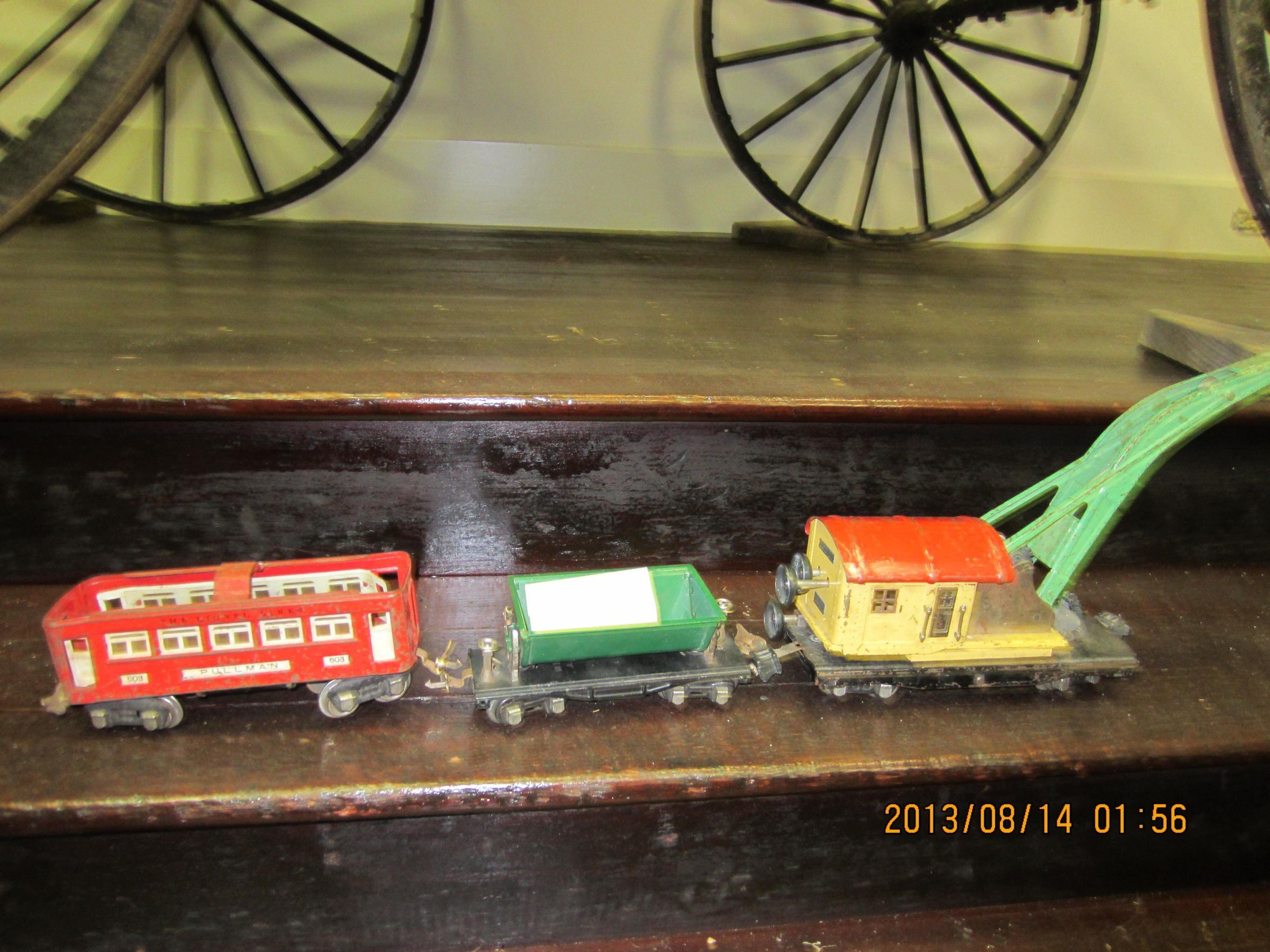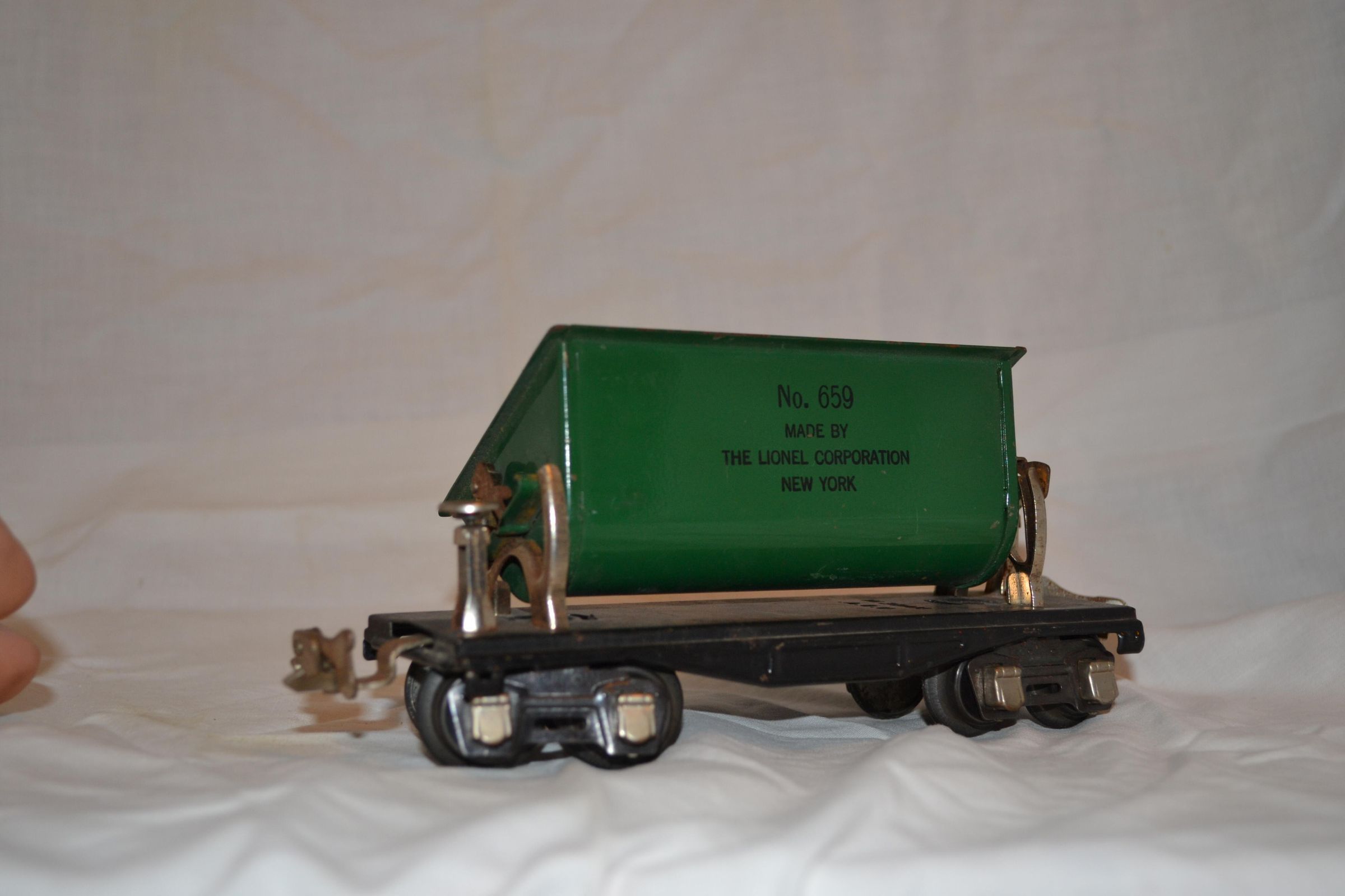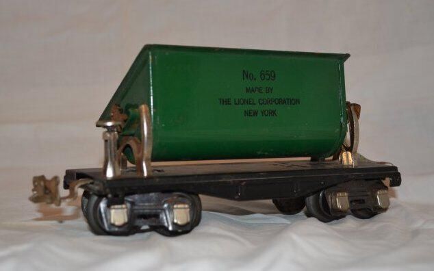 metal toy train car, flat bed on two 4-wheel chucks, on which is mounted a tilting open-top container (for grain?). On side of container "No. 659 - MADE BY - THE LIONEL CORPORATION - NEW YORK" and on the underside stamped into the metal flat bed is "MADE IN U.S.A."