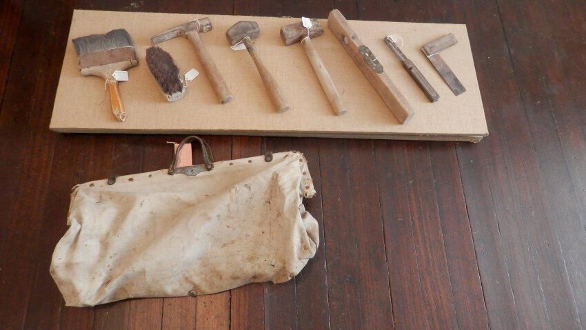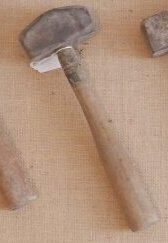 From the set of tools belonging to and well-used by Frederick A Lee, master mason of Islesboro during the first half of the 20th century. See book "Summer Cottages of Islesboro" p. 119. This hammer is one of 3 in the tool bag. This one is 12" long, the heavy metal head 4" long with both ends blunt.