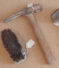 From the set of tools belonging to and well-used by Frederick A Lee, master mason of Islesboro during the first half of the 20th century. See book "Summer Cottages of Islesboro" p. 119. This hammar is one of 3 in the tool bag. This one is 11" long, the heavy metal head 7" long with one blunt end, the other end a long pointed claw.
