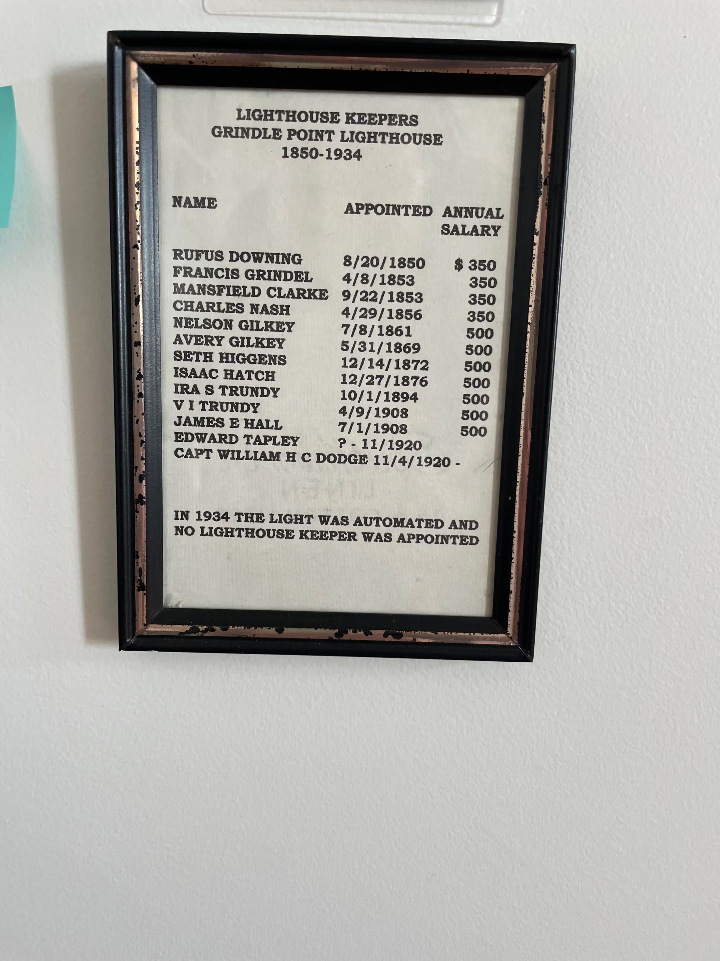 A complete list of Keepers at the Grindle Point Lighthouse. This list includes the dates that each keeper served as well as their annual salary.