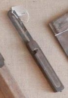 From the set of tools belonging to and well-used by Frederick A Lee, master mason of Islesboro during the first half of the 20th century. See book "Summer Cottages of Islesboro" p. 119. This all metal tool is 10" long with a movable metal blade which can be set to measure any angle from 0 to 270. The handle has an indented etched area to make it less slippery when wet.