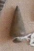From the set of tools belonging to and well-used by Frederick A Lee, master mason of Islesboro during the first half of the 20th century. See book "Summer Cottages of Islesboro" p. 119. This plumb bob is brass with a metal tip, 2.75" long, tapering to a sharp point . The line is still attached to the top which has a mushroom shape, a hole in the top and neck in order to attach a line which allows it to hang "free." The plumb line with weighted "bob" is used to determine verticality.