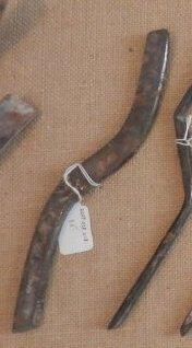 From the set of tools belonging to and well-used by Frederick A Lee, master mason of Islesboro during the first half of the 20th century. See book "Summer Cottages of Islesboro" p. 119. This metal tool is to shape mortar between stones or bricks. The tool is formed from a 3/4: x 1/4" flat length of metal. It is 10.75" long, slightly S-shaped,( e.g. the center 2" is angled). Each 4" end tapers to a 3/4" wide beveled point for shaping mortar between bricks or stones..