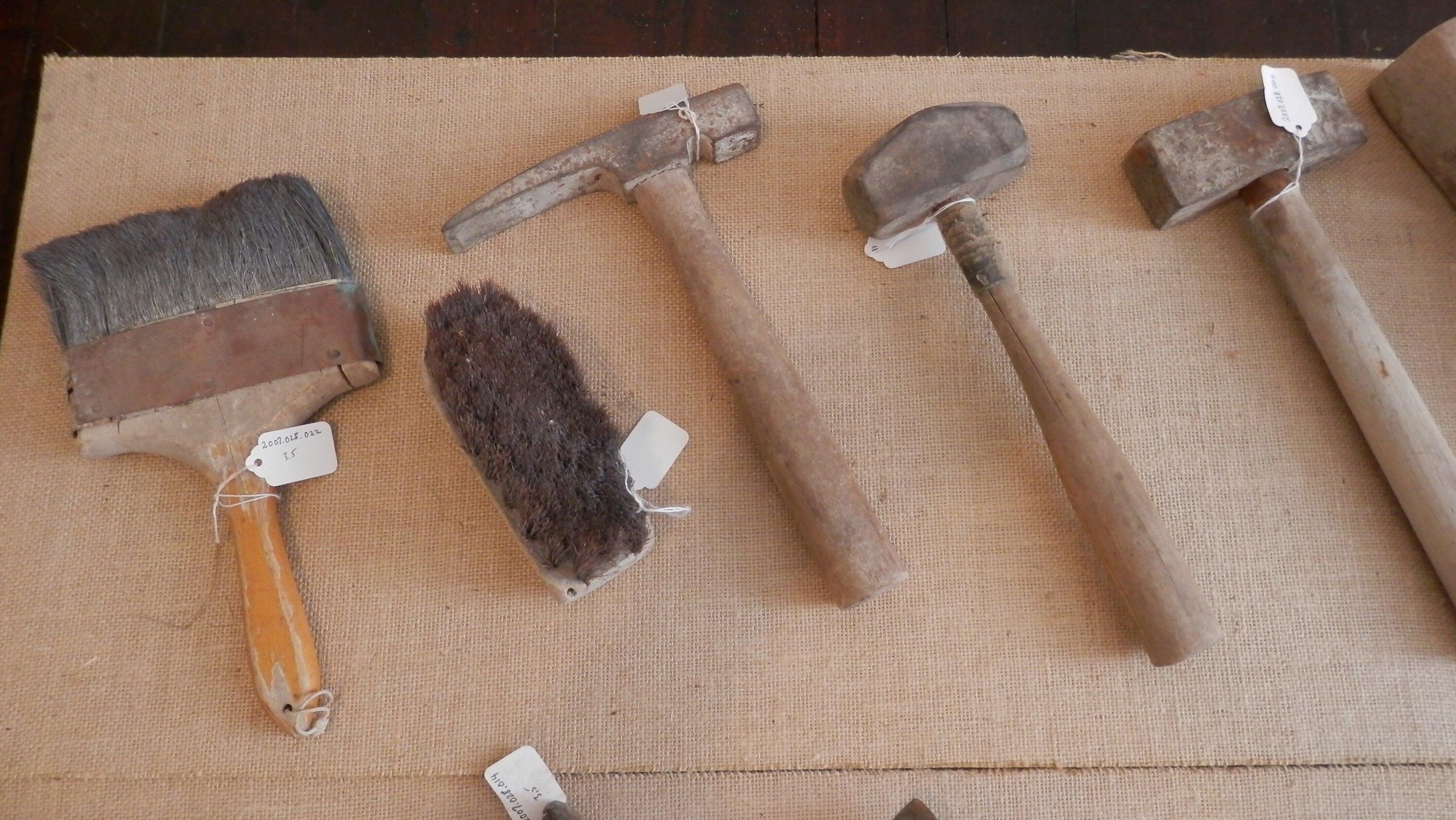 From the set of tools belonging to and well-used by Frederick A Lee, master mason of Islesboro during the first half of the 20th century. See book "Summer Cottages of Islesboro" p. 119. This brush is probably the end of a floor brush, sawed off to 6" length, rounded wood top, 1.5" bristles well-worn. It was certainly used for brushing mortar, perhaps to clean off bricks or stones, or to brush on stucco.