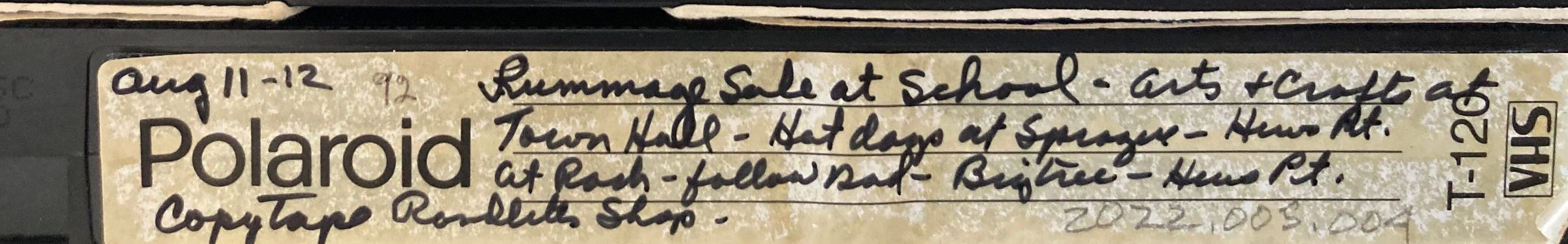 Video recording by Rocky Coombs dated August 11-12, 1992. Label lists rummage sale at the school, arts and crafts at the Town Hall, hot dogs at Sprague, etc. Identified as a copy tape.