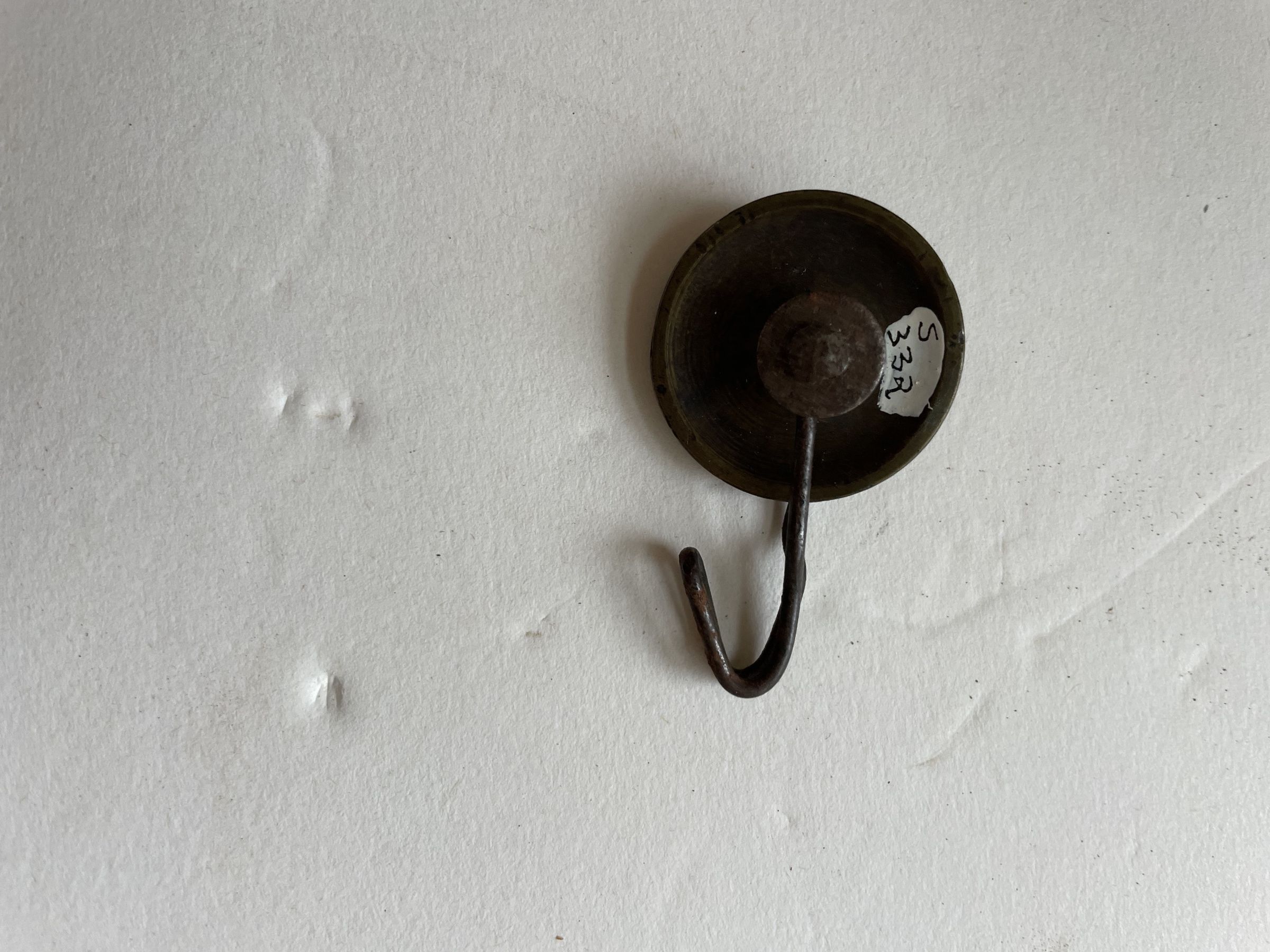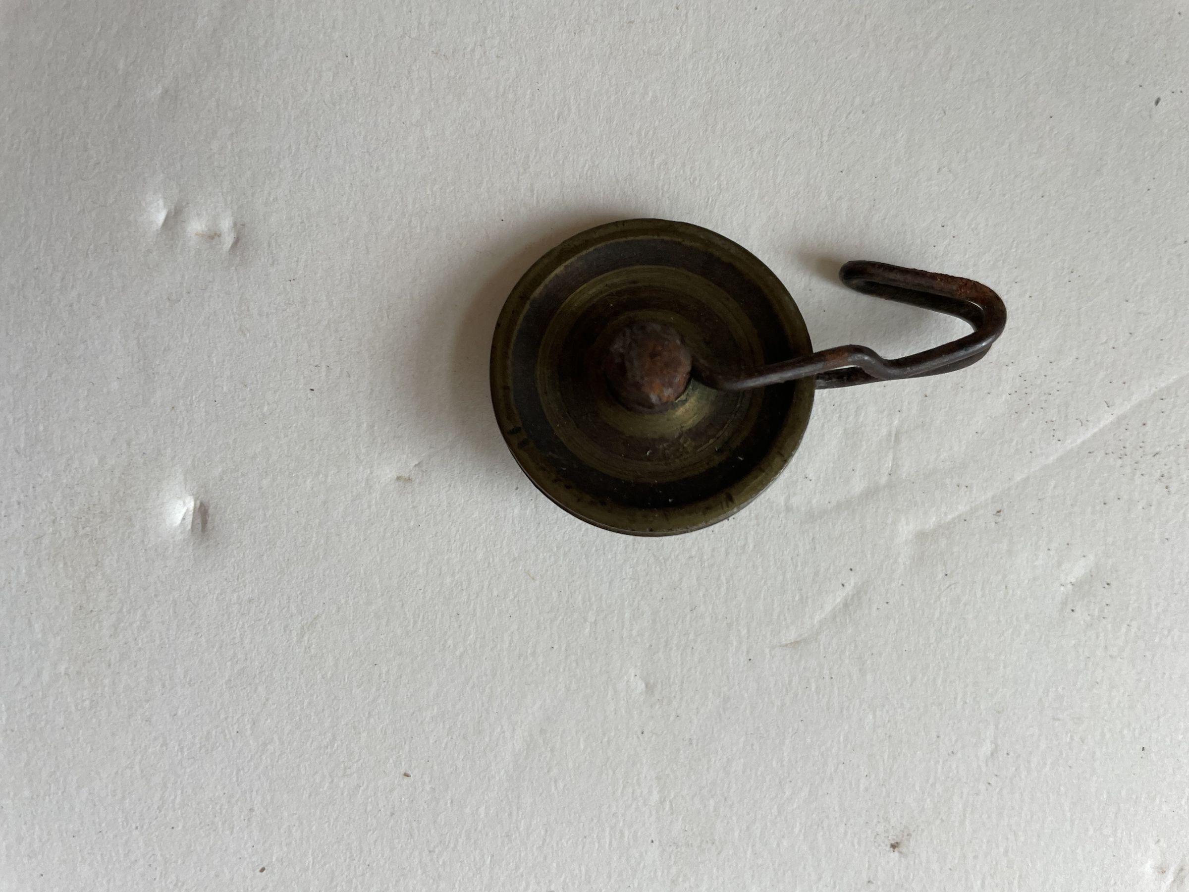 Small metal wheel with a wire hook. The wheel in the center spins and has a track for small wire or twine.