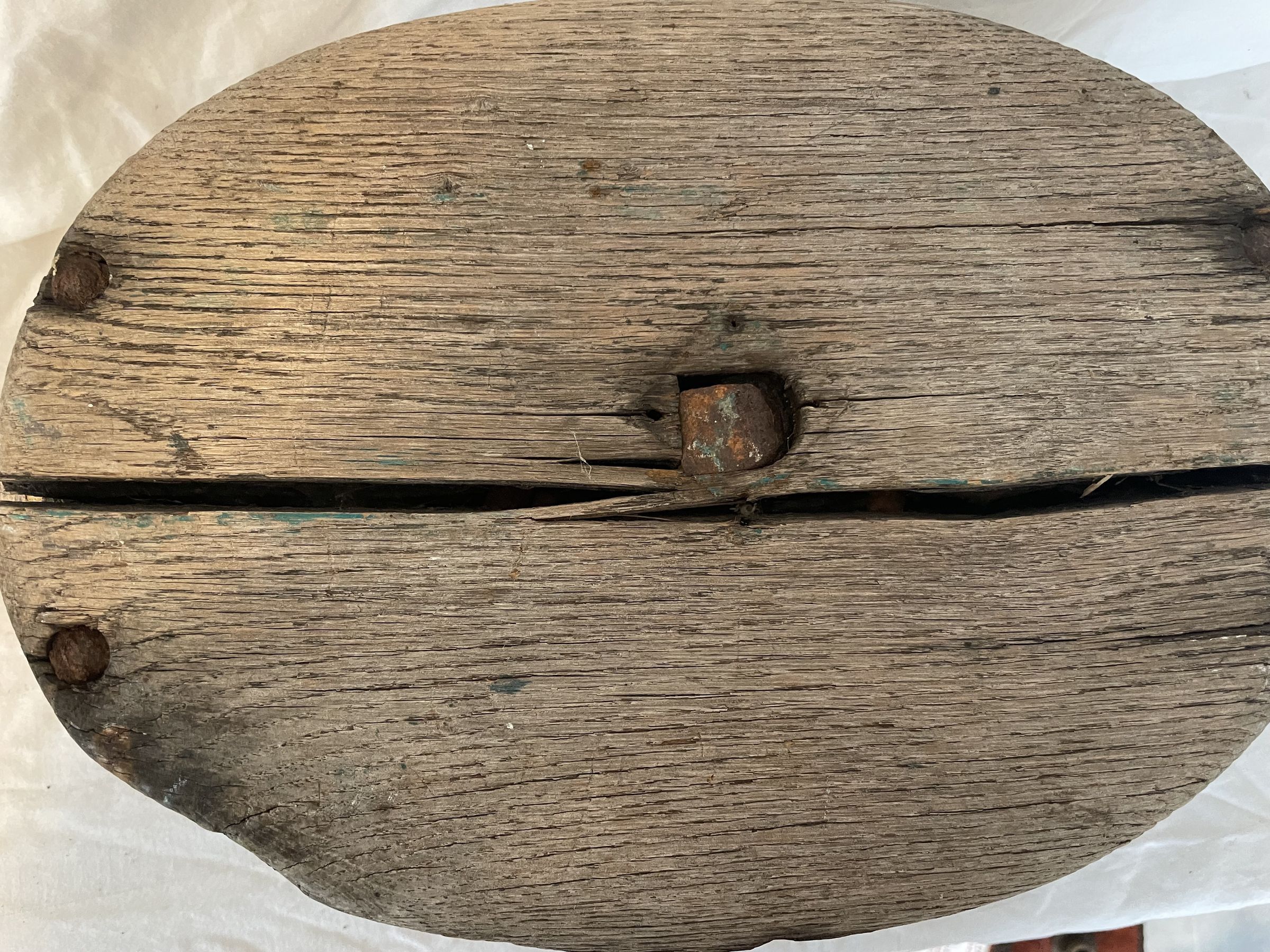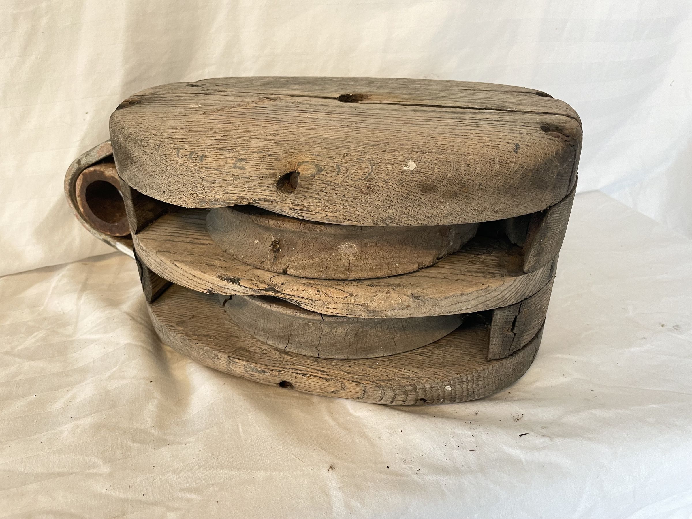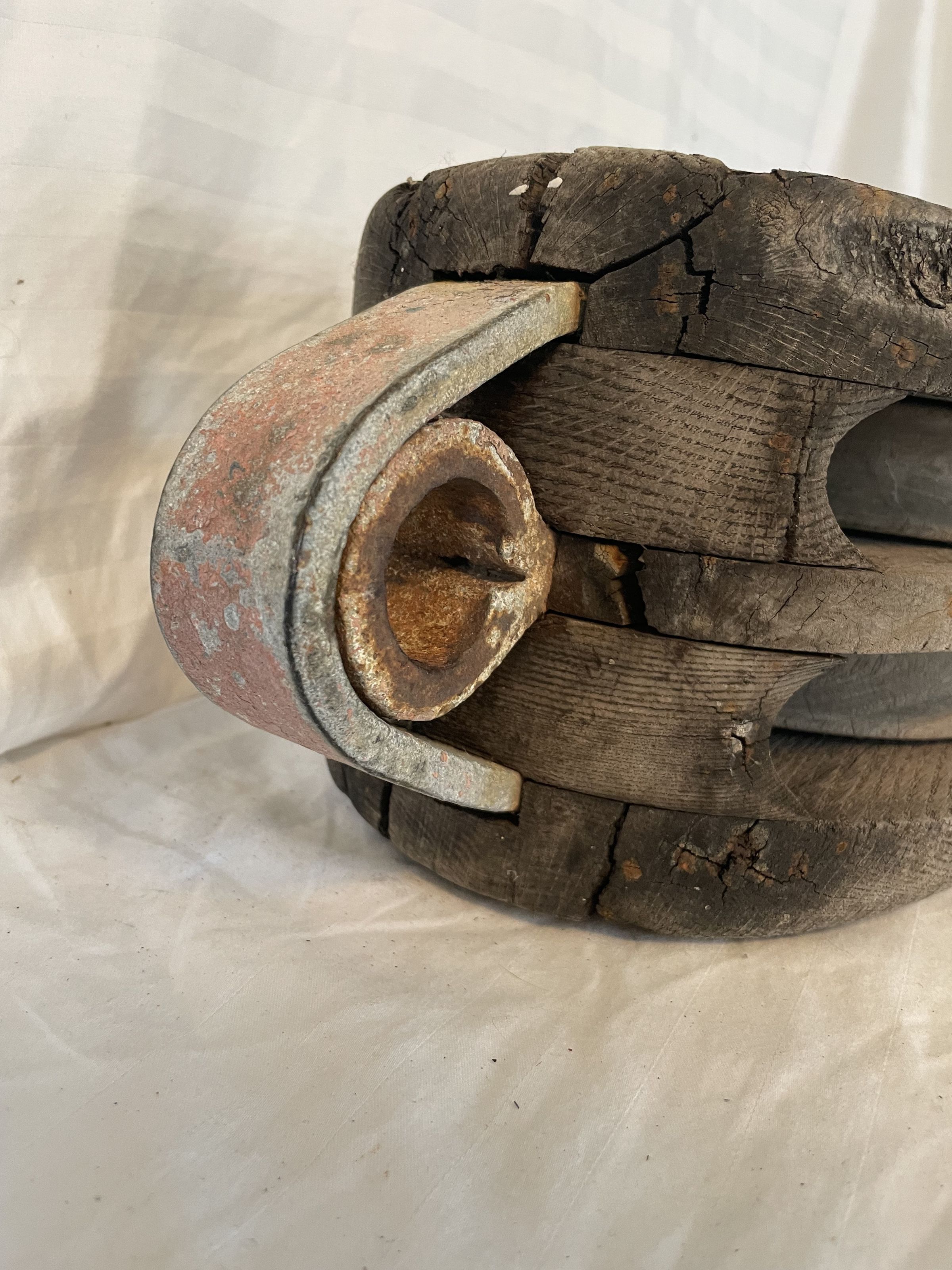 A large wooden block and tackle. It has two center wheels and was most likely used on a large schooner or other large sailing vessel