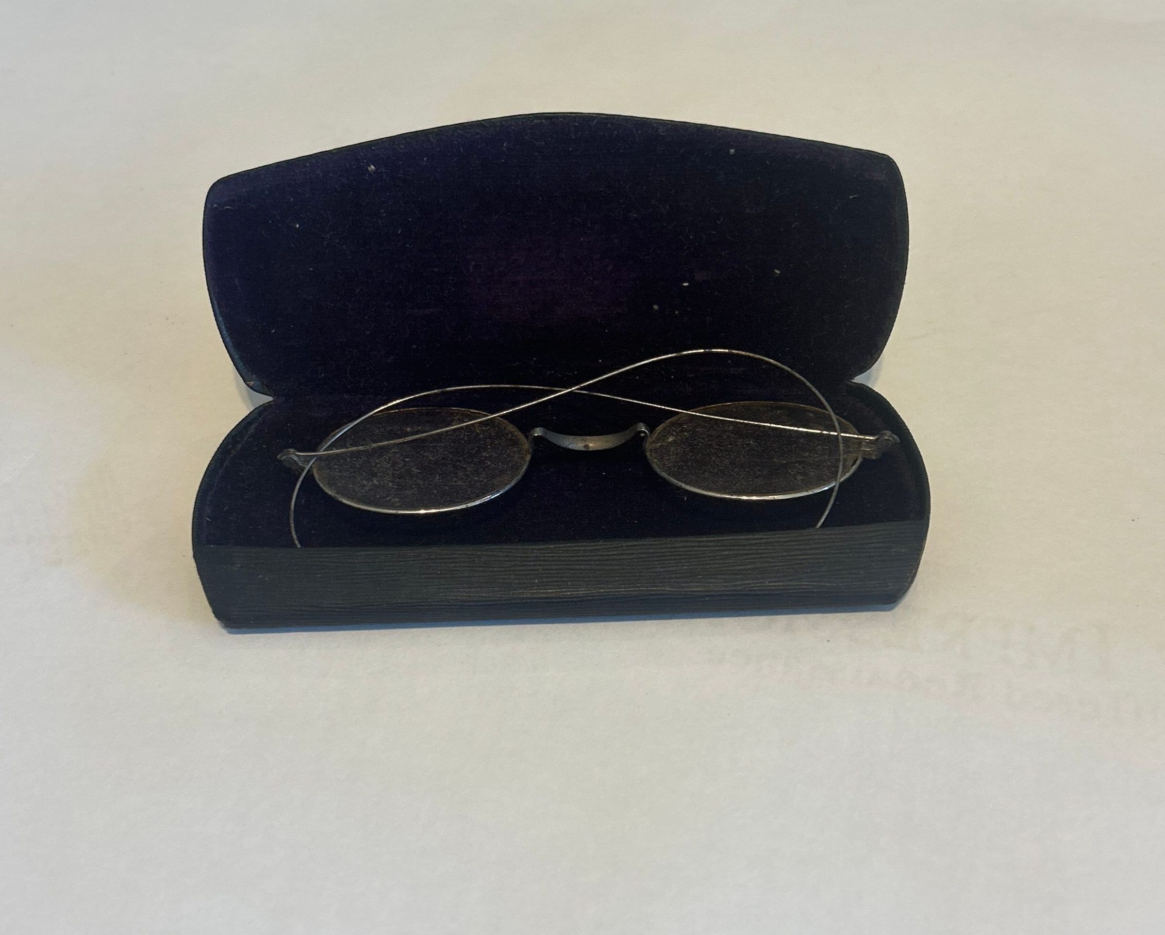 Wire-framed eyeglasses in black case, made by Samuel Adams, optician, of Belfast, ME. Belonged to some member of the Heald (Heal?) family.