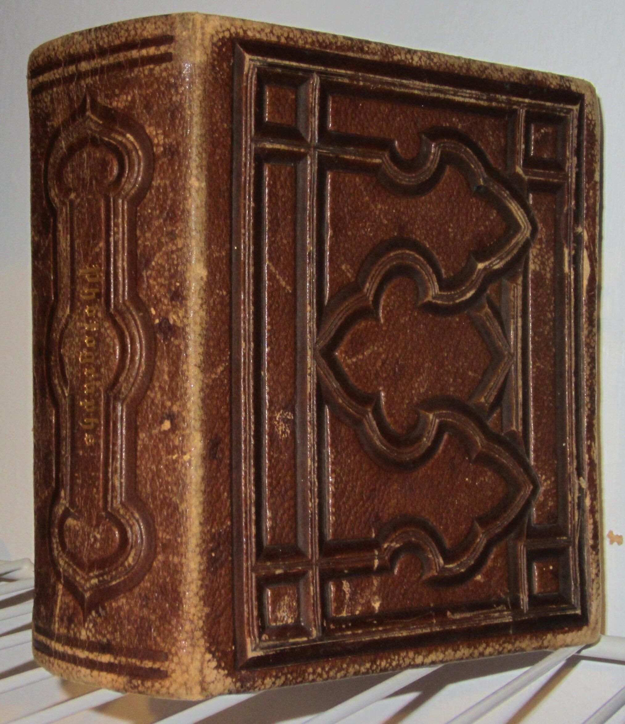 This album is a small elegant album for photographs, tintypes etc. It measures 5.25" x 6" and is 2 1/4" thick. The cover is leather with an intricate pressed design. It was made in Boston (no other identification). Presumably it was issued shortly after the Civil War: the first picture, obviously commercial, is of the apotheosis of Lincoln, ascending through clouds, in the arms of Washington who is preparing to put a laurel wreath on Lincoln's head. The last frames in the book are one of Lincoln (with beard) and the other is of Washington, in uniform, with Martha, the Custis children, a copy of a painting. The album contains some tintypes, some photos. Several are of soldiers (Civil War uniforms I think). None are identified. This album presumably belonged to Benny Heald since it was found in the Heald house.