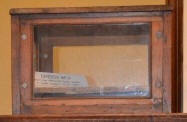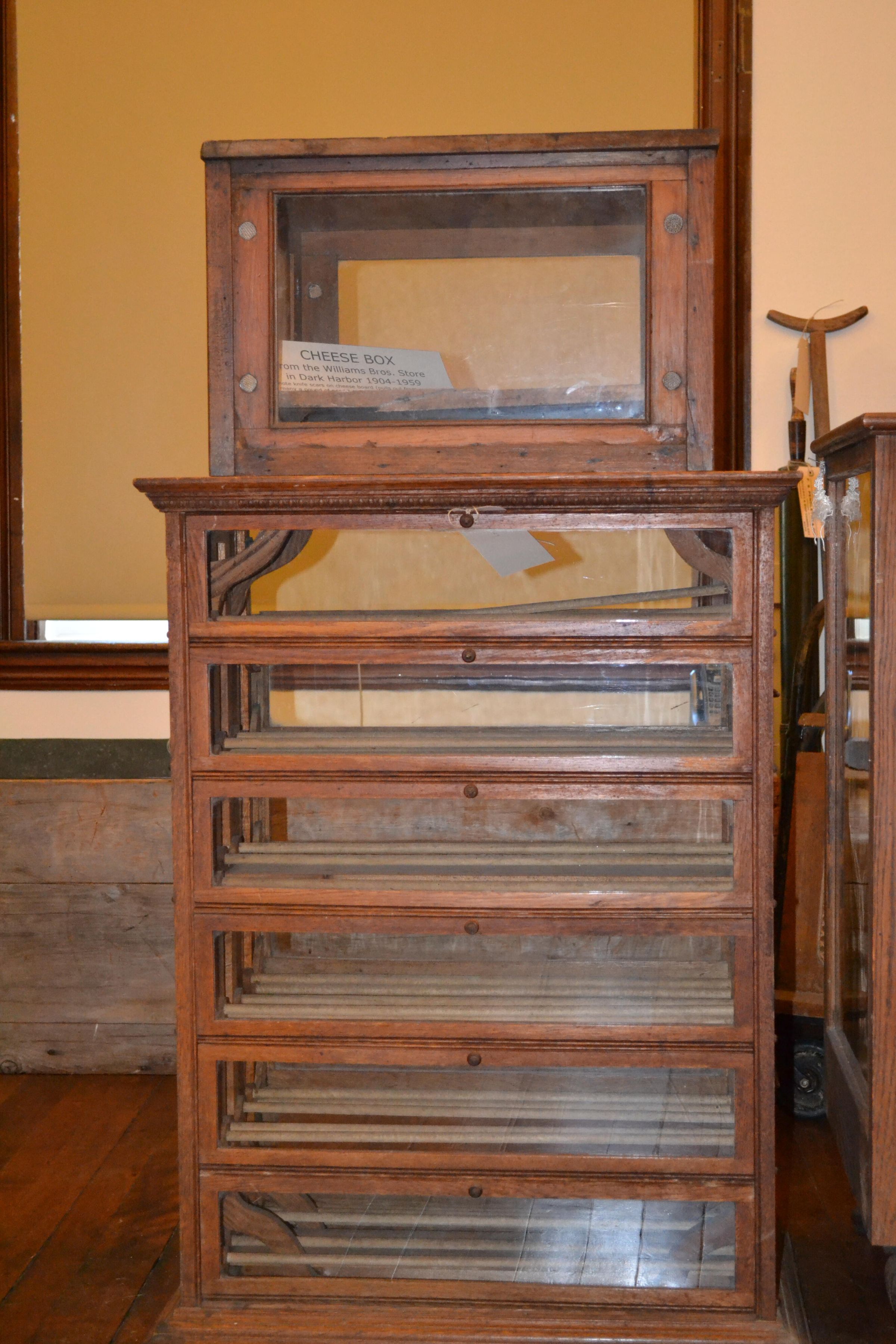 Wooden Cheese Box from the old Williams Store (1904-1959) in Dark Harbor, ME. Wood frame with three sides glass, and top, bottom, and rear solid wood panels. Rear panel of box opens, wood tray holding cheese can be rolled out and cut . Cheese boards show evidence of many cuttings with knife. Came with a second wood cheese/cutting board/ tray. Trays have metal rollers on four corners underside