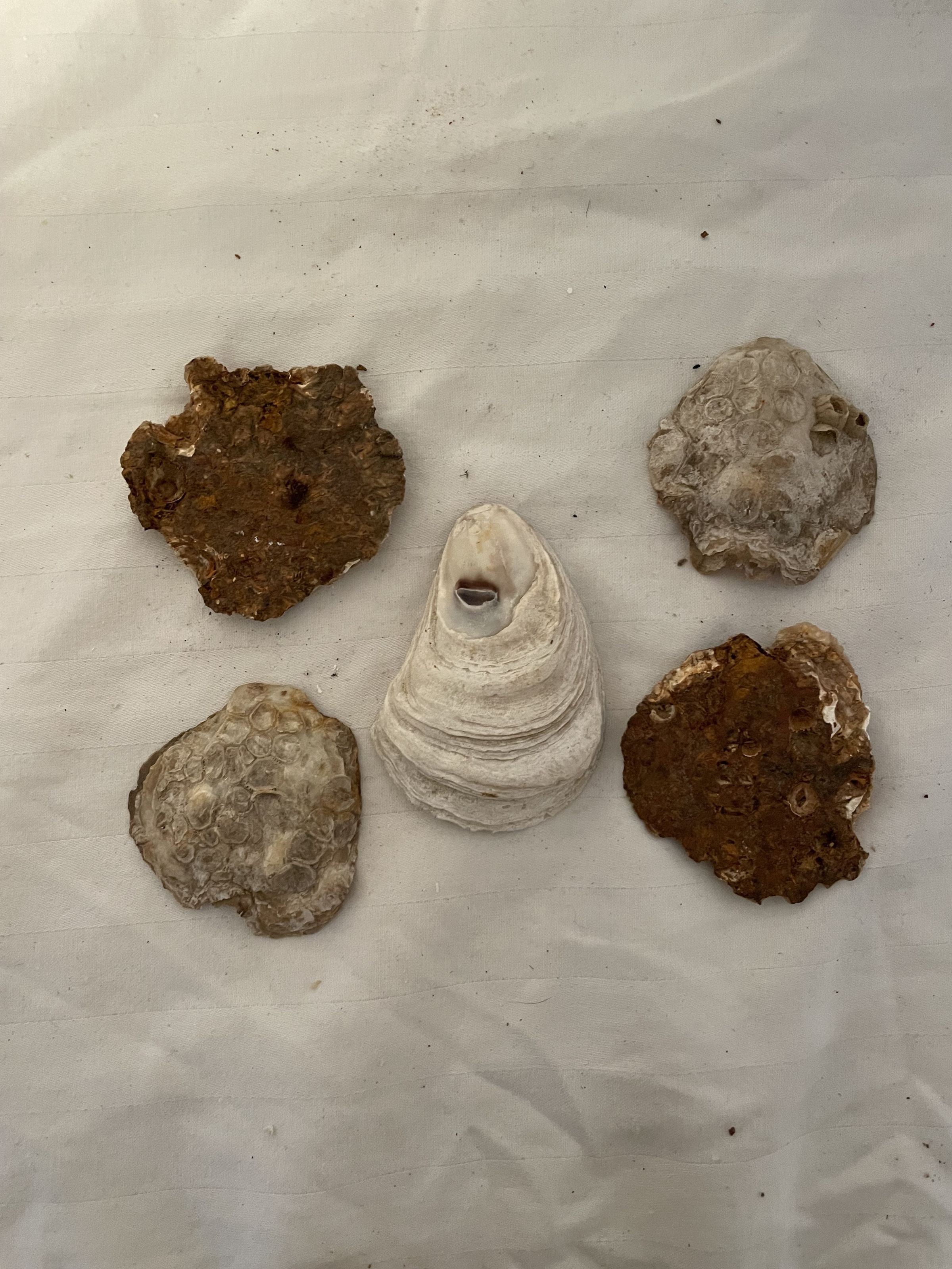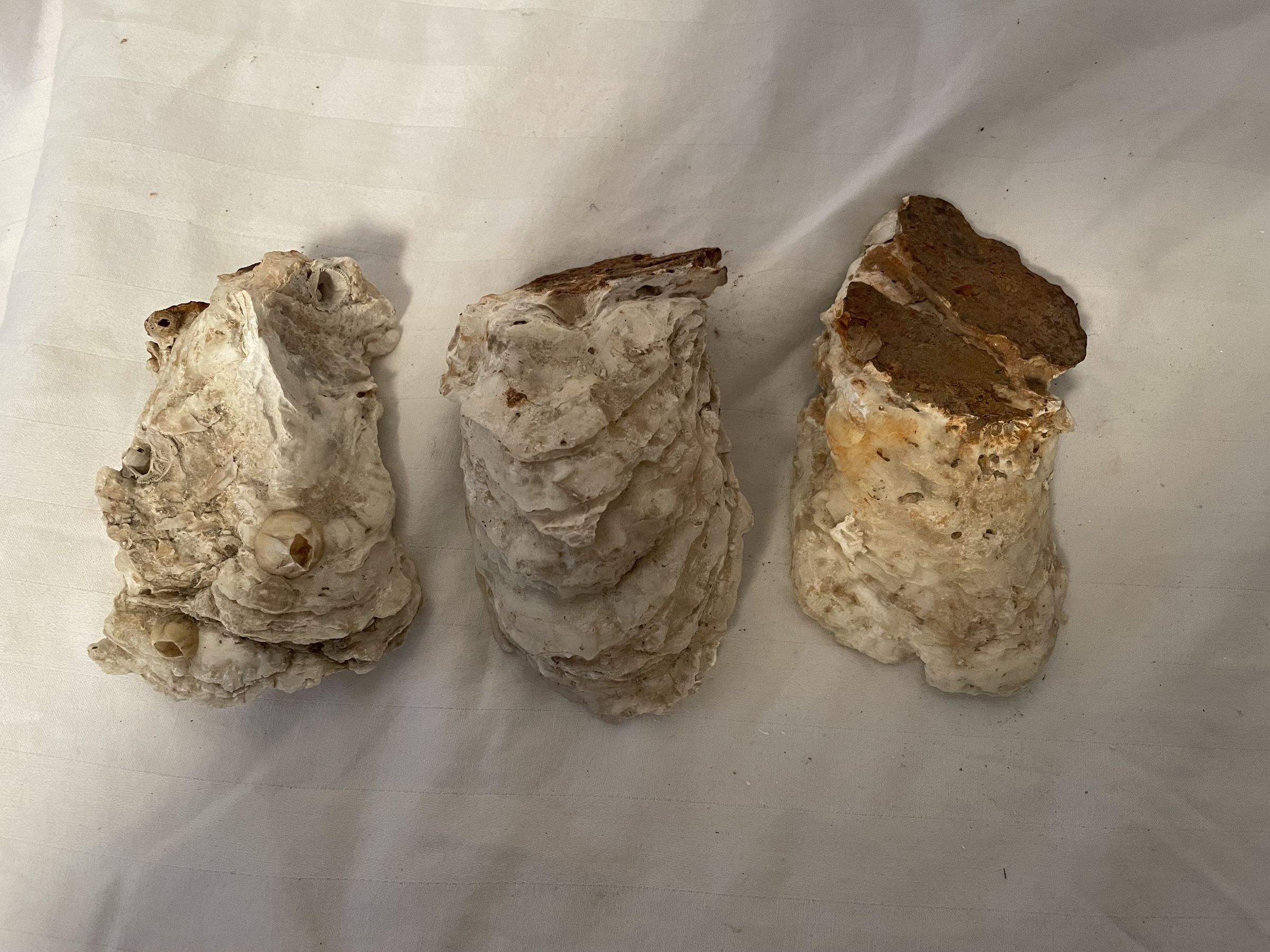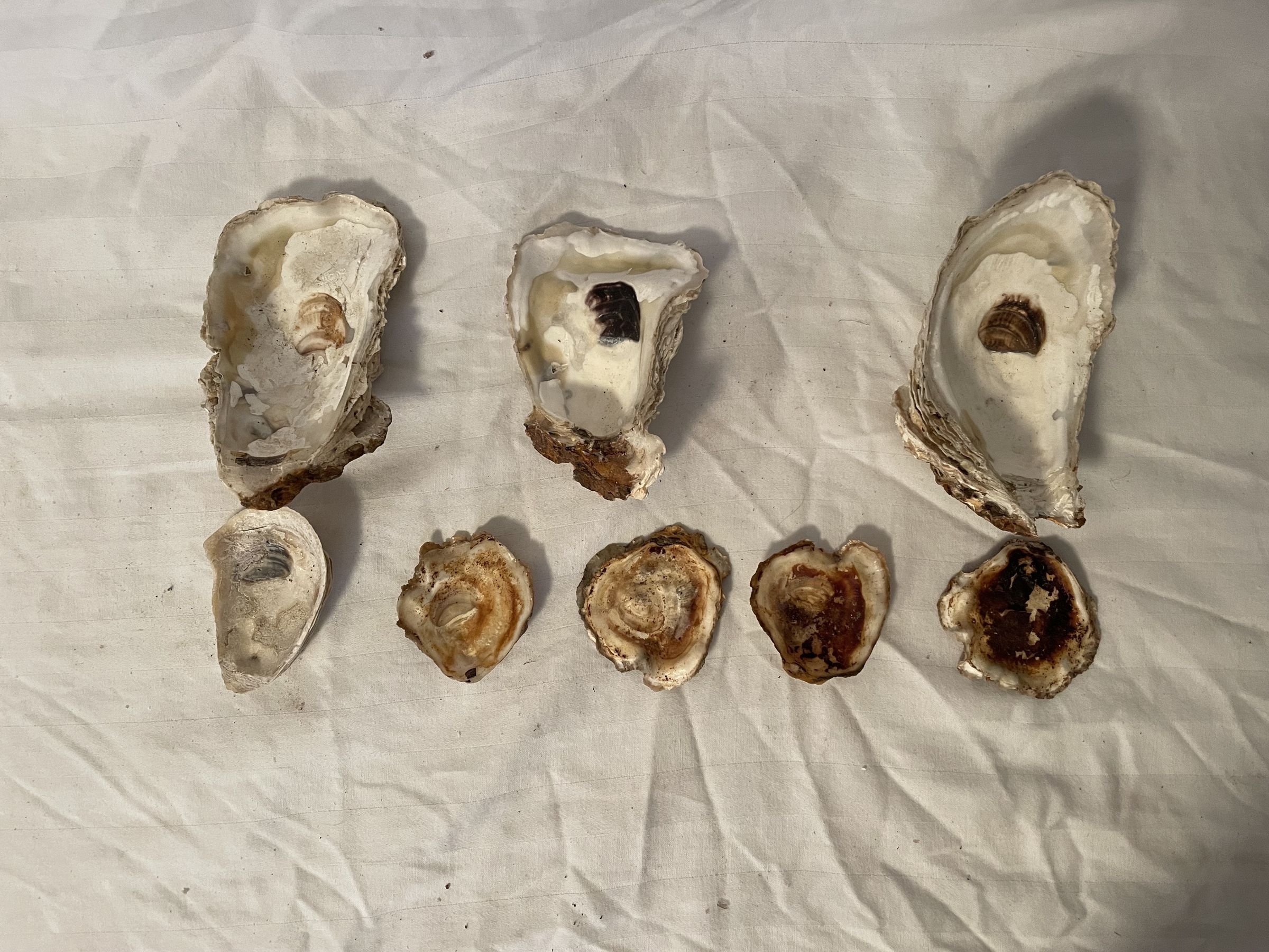 A collection of eight oyster shells collected from the bottom of SS America. Some of the shells have extreme rust. There are many sizes of shells, three large and five medium shells