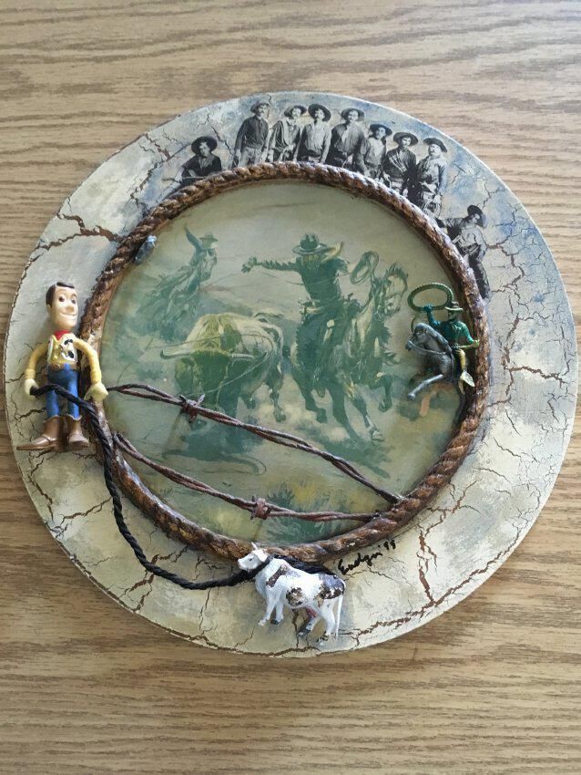 Found-object assemblage evoking myths of the American West. Circular frame, 14" diameter.