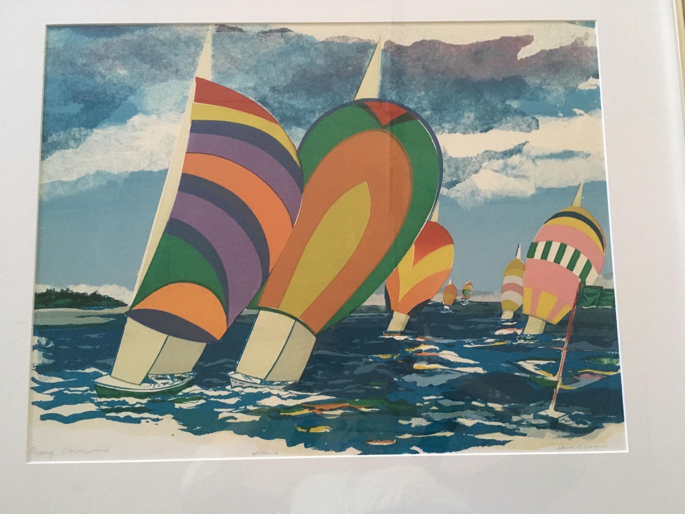 Framed, signed edition, number 16, of colored print "Racing Downwind," 23" x 28"