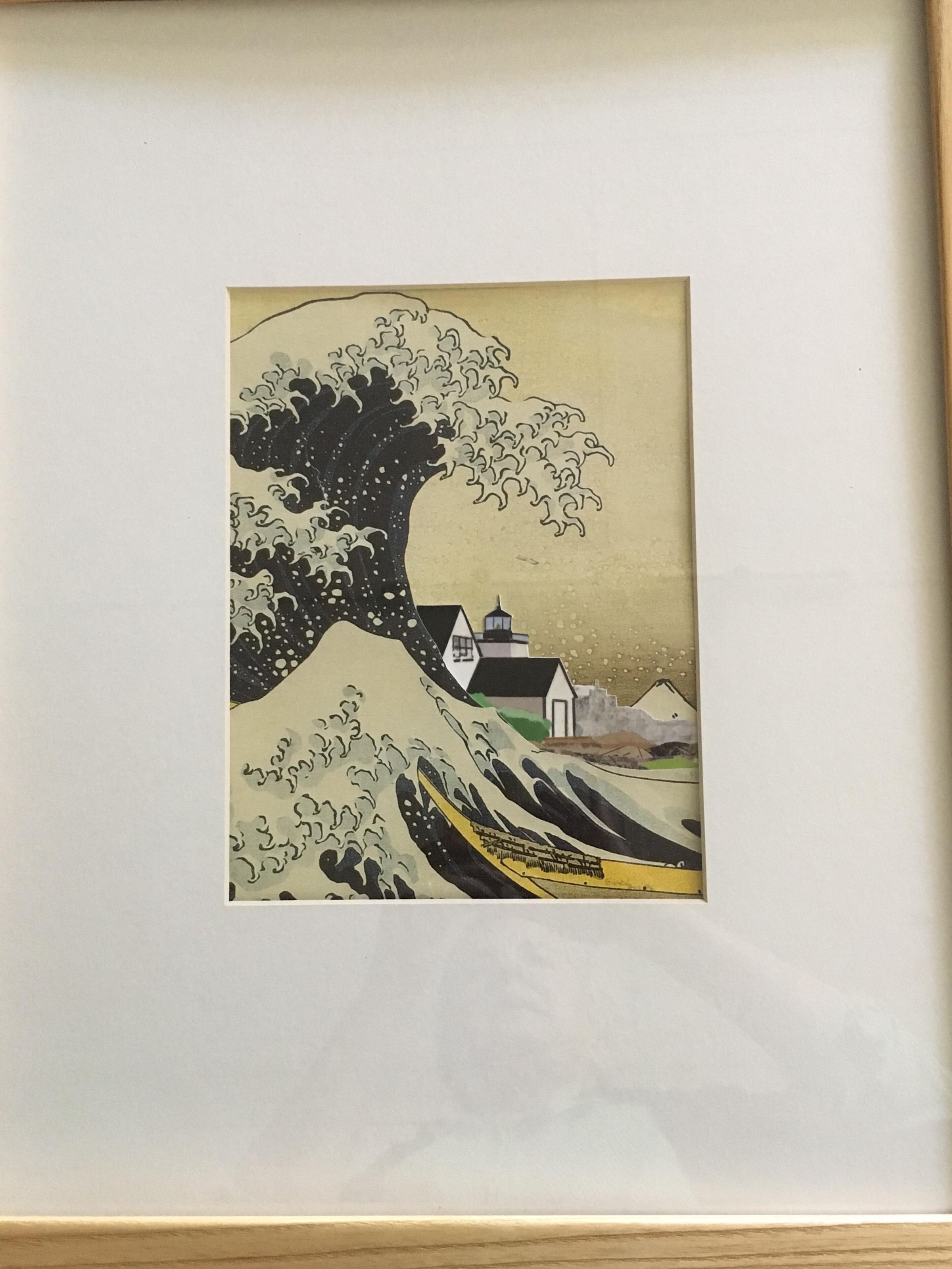 Cut-paper collage depicting Grindle Point Lighthouse under Hokusai's "Great Wave off Kanagawa." Framed, 17" x 21"