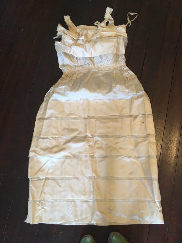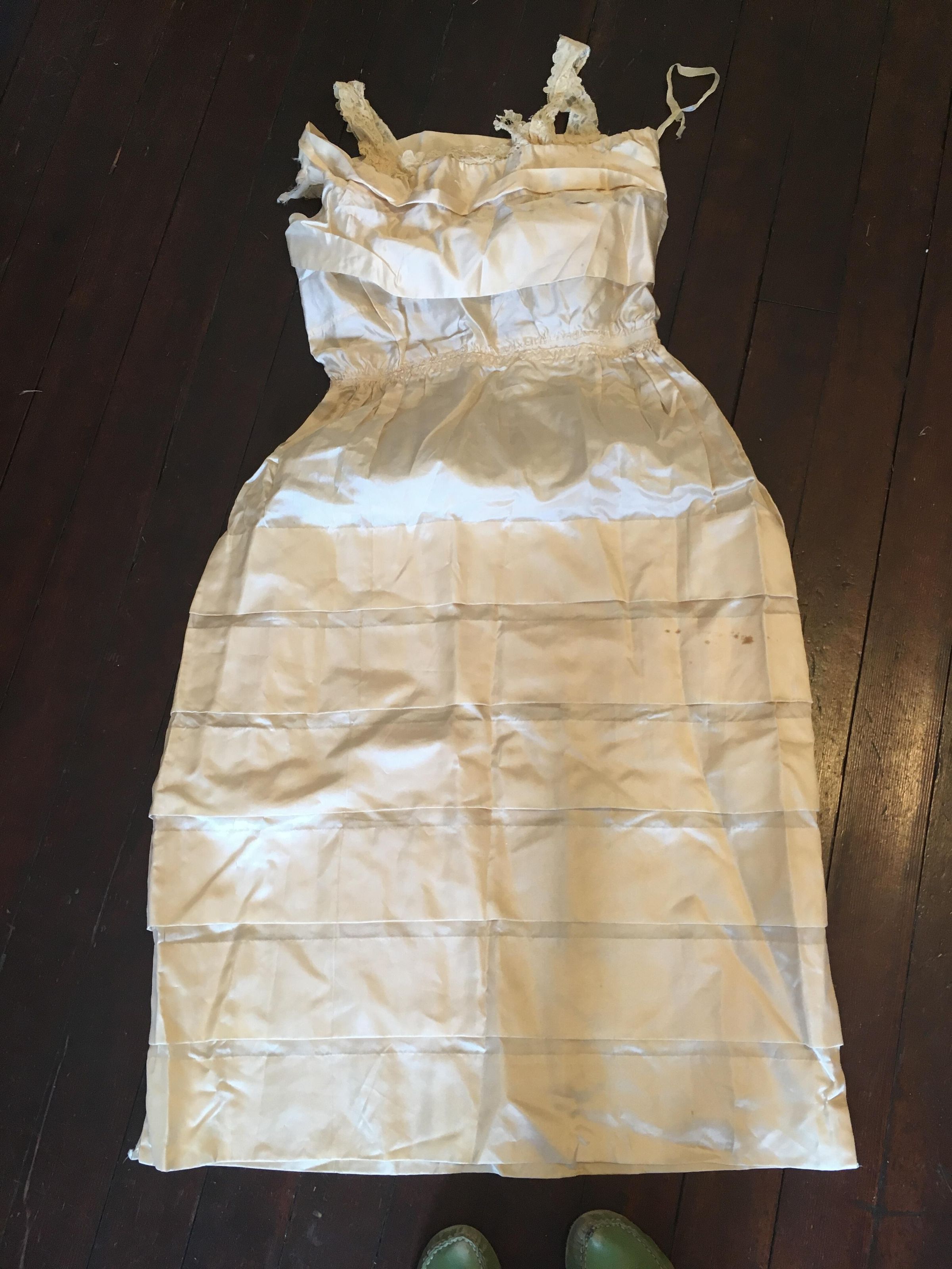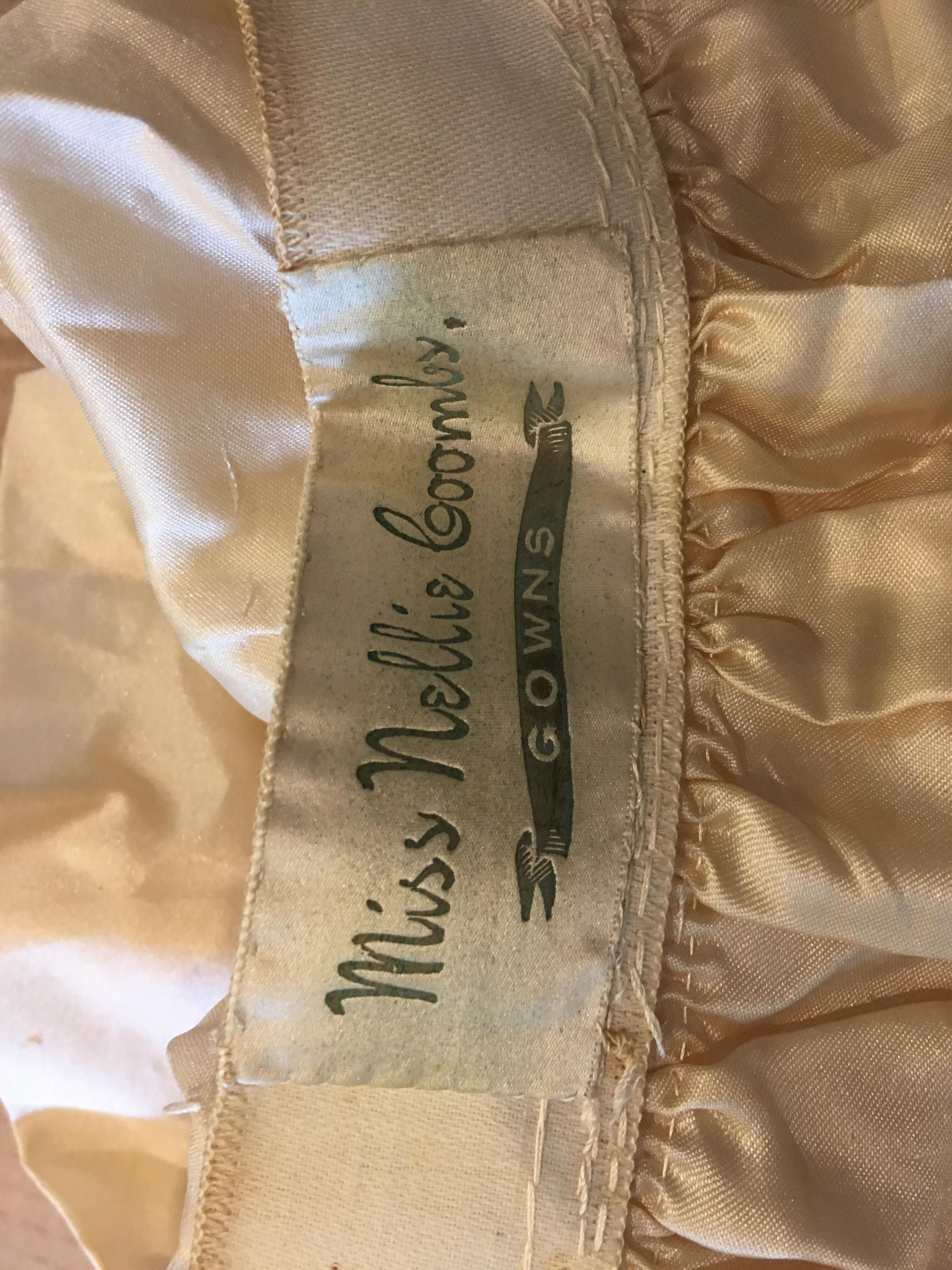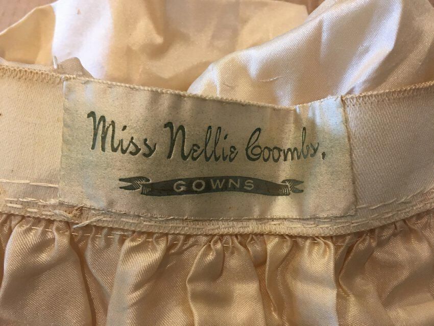 Ivory silk frock, very pretty, very fragile. Sleeveless, lace binding across bodice, lace straps, side hook-and-eye-fasteners, horizontal pleating. Inside the waistband is the label "Miss Nellie Coombs, Gowns"