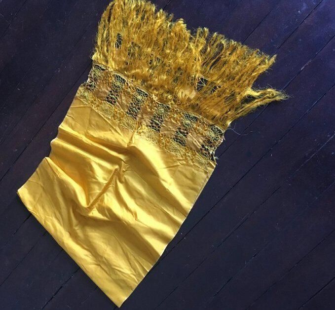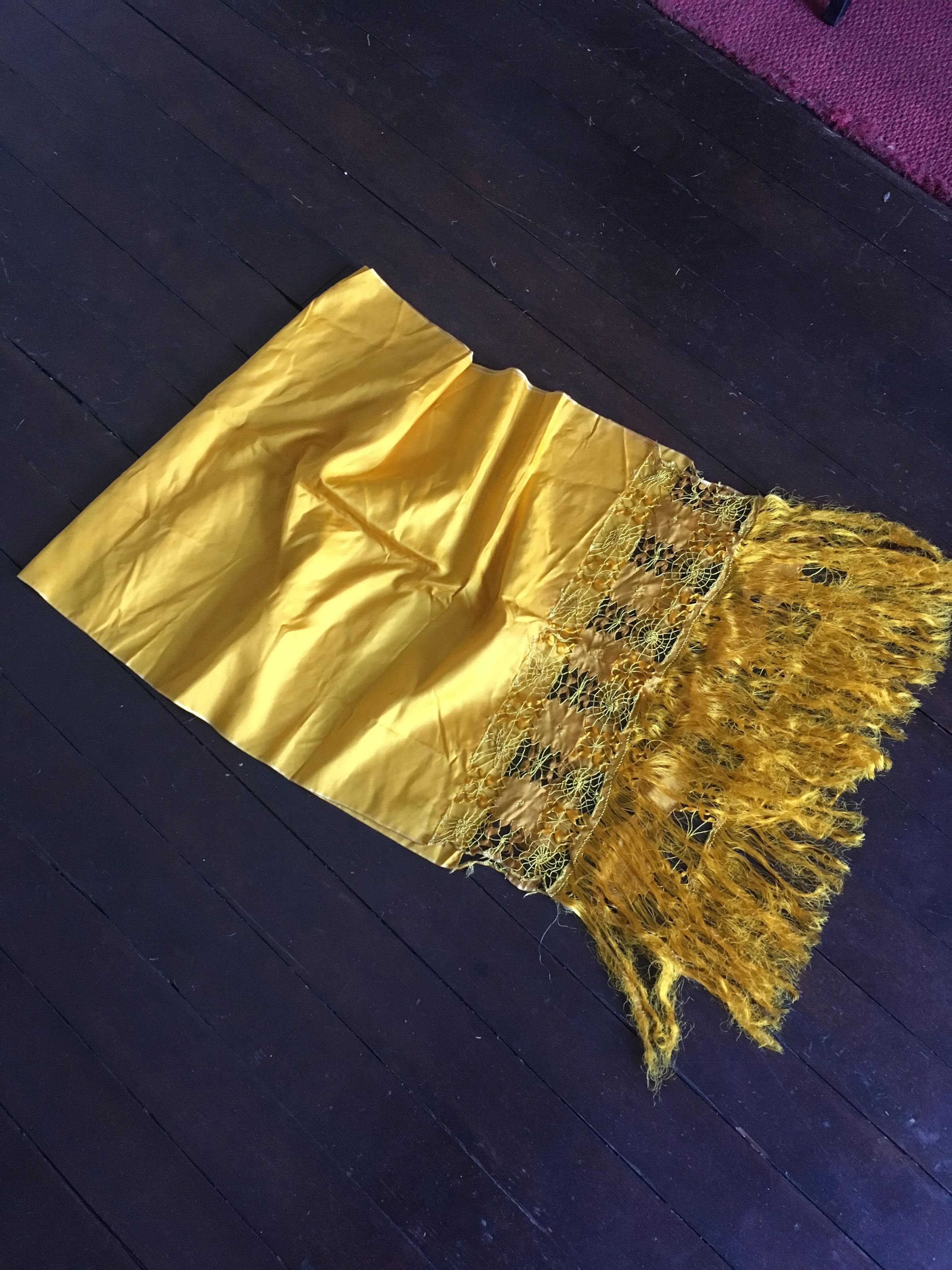 Pumpkin-colored fringed shawl, silk, fair condition.