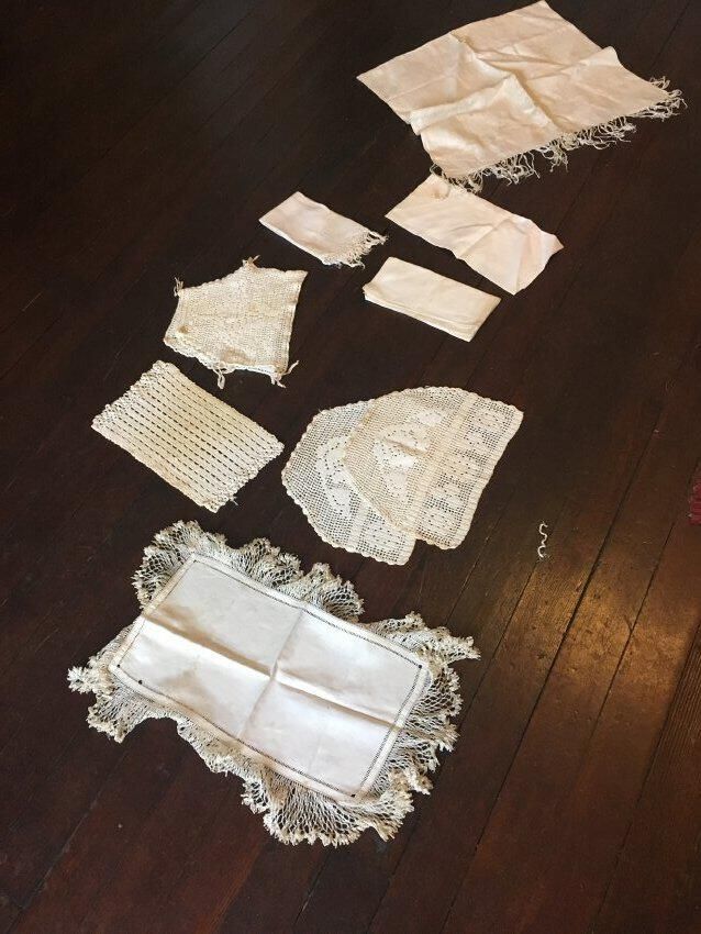 Assortment of table linens: three crocheted pieces, two damask linen napkins of different patterns, one fringed hand towel with the initial P, two fringed table runners / tray coverings. All much stained, otherwise fair condition.