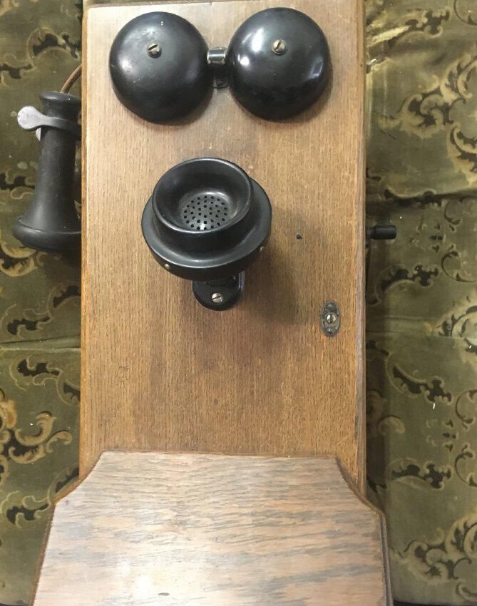 Crank telephone from the summer home of Douglas Dillon. Oak box, bells, mouthpiece, and crank (8" w x 18" l x 6" deep; small angled shelf extends depth by 3" and width by 1").