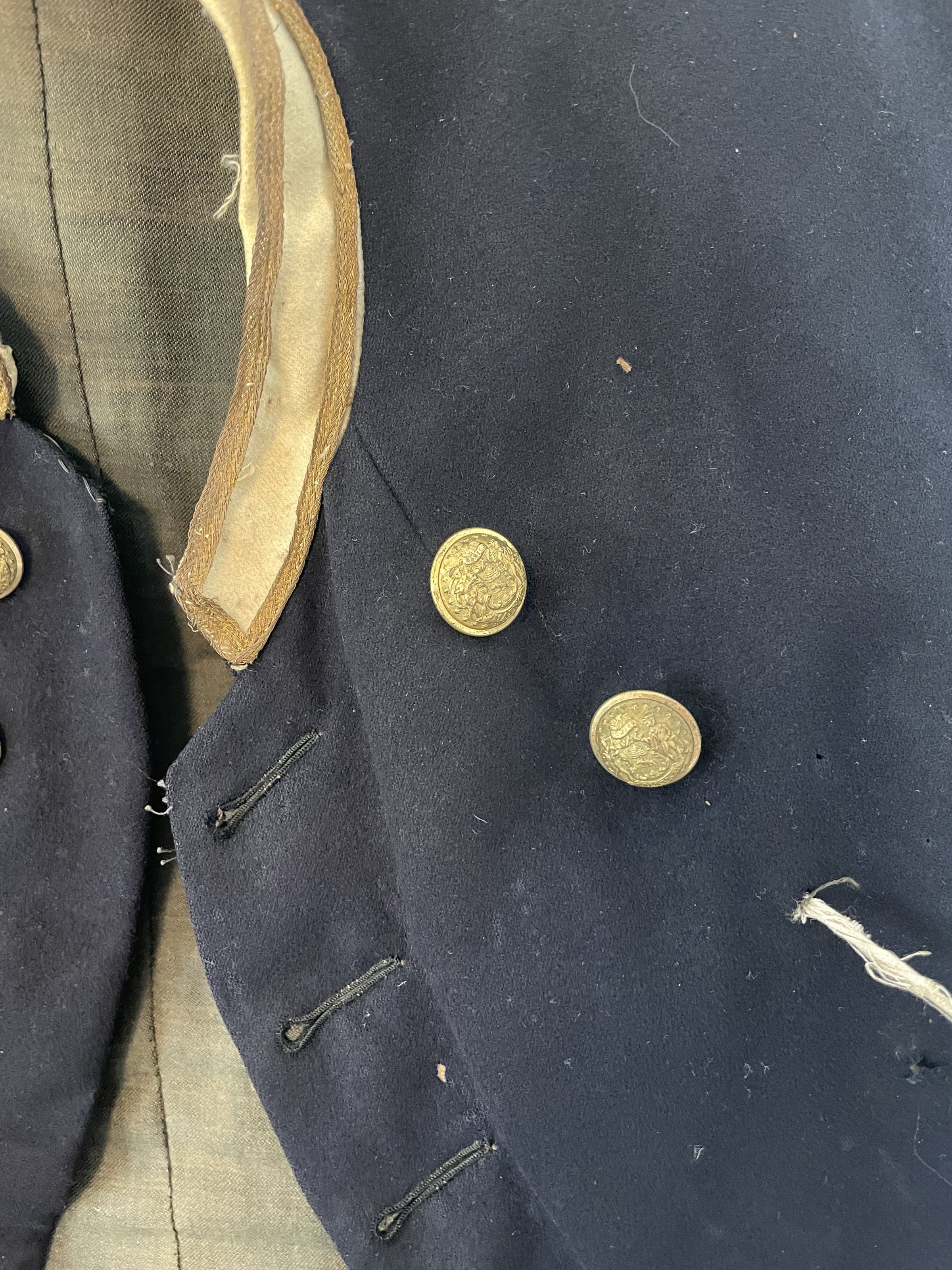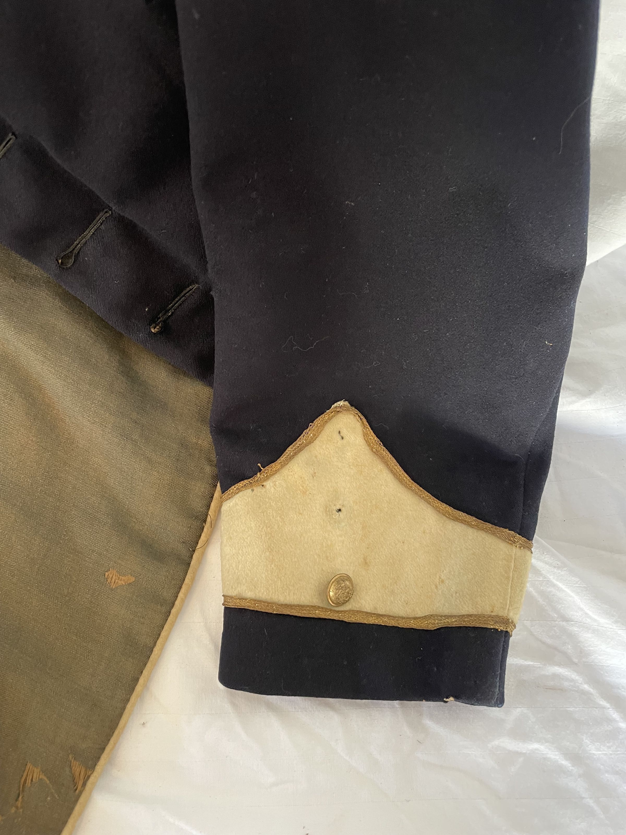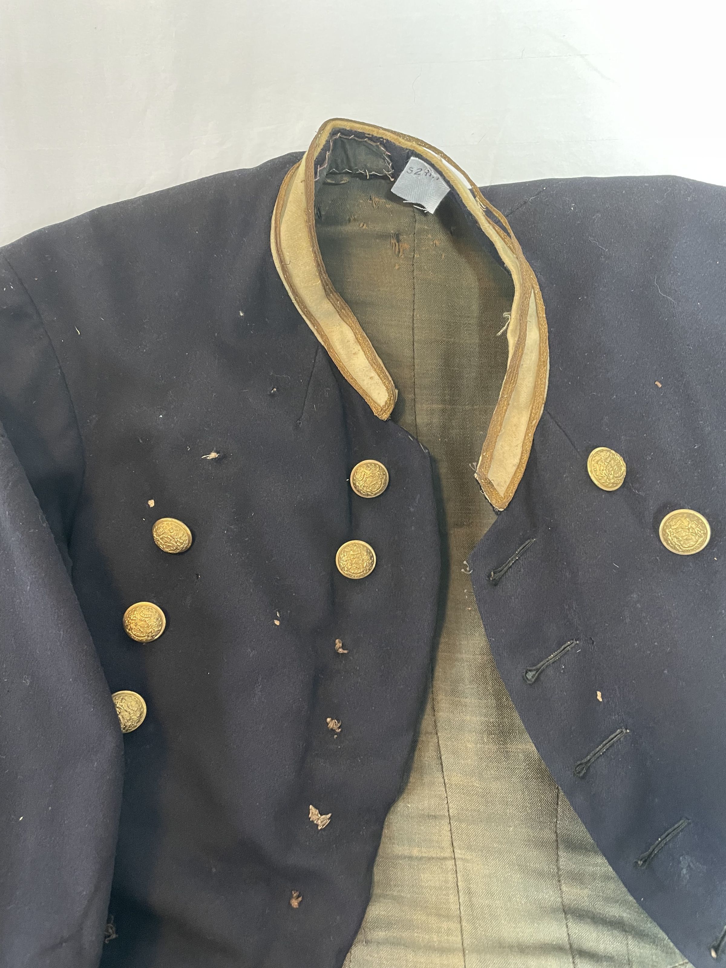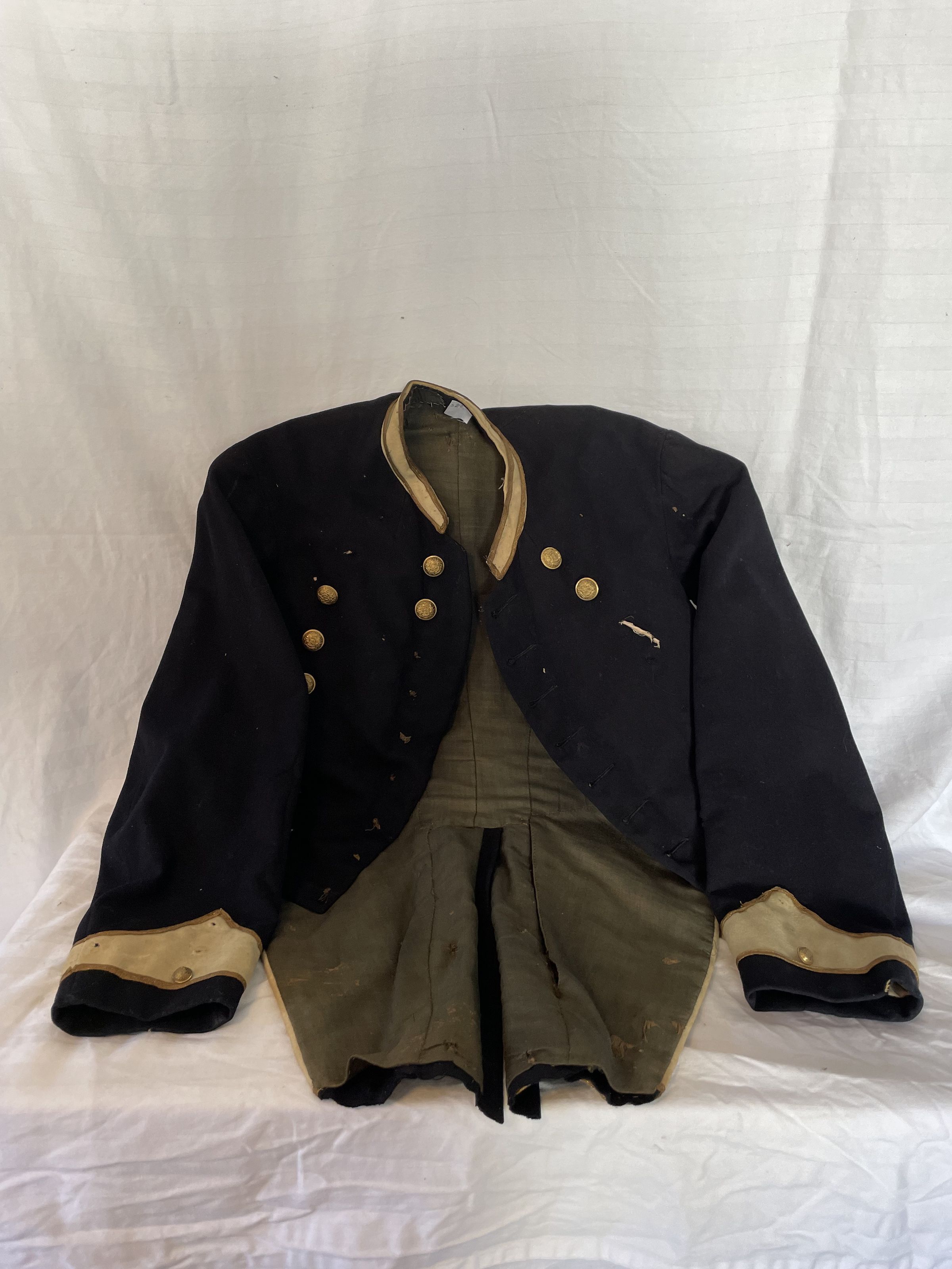 Black band jacket, with green lining and gold buttons. The jacket has a white collar with gold lining that match the fabric on the cuffs.