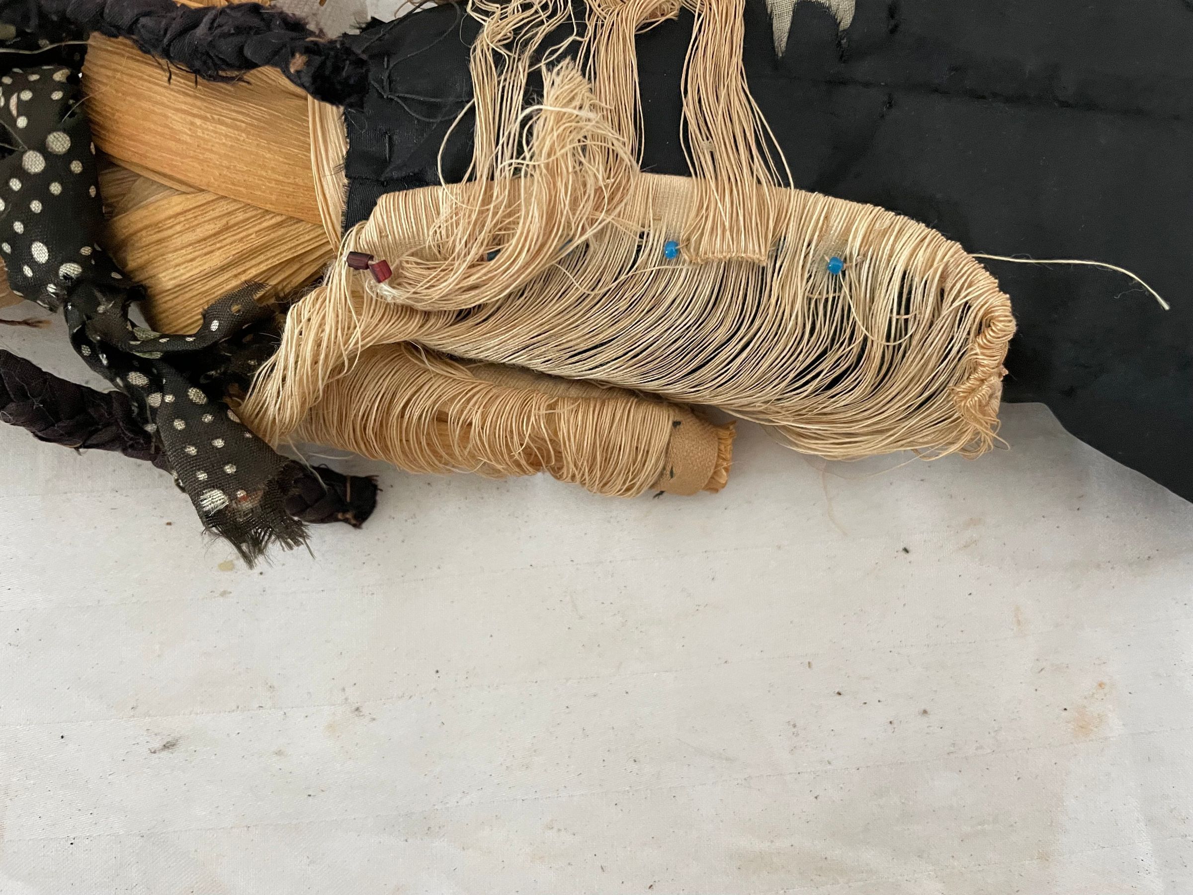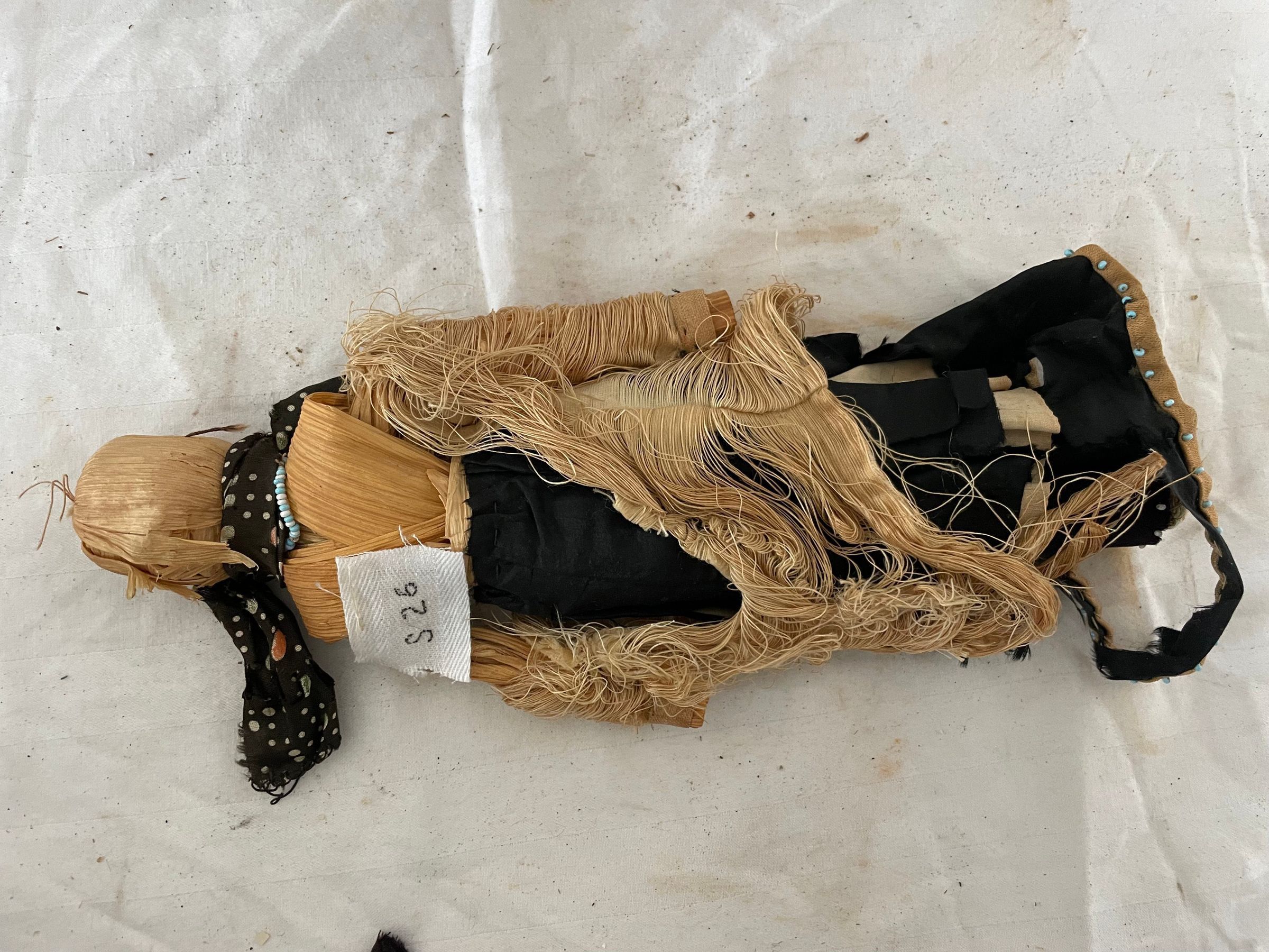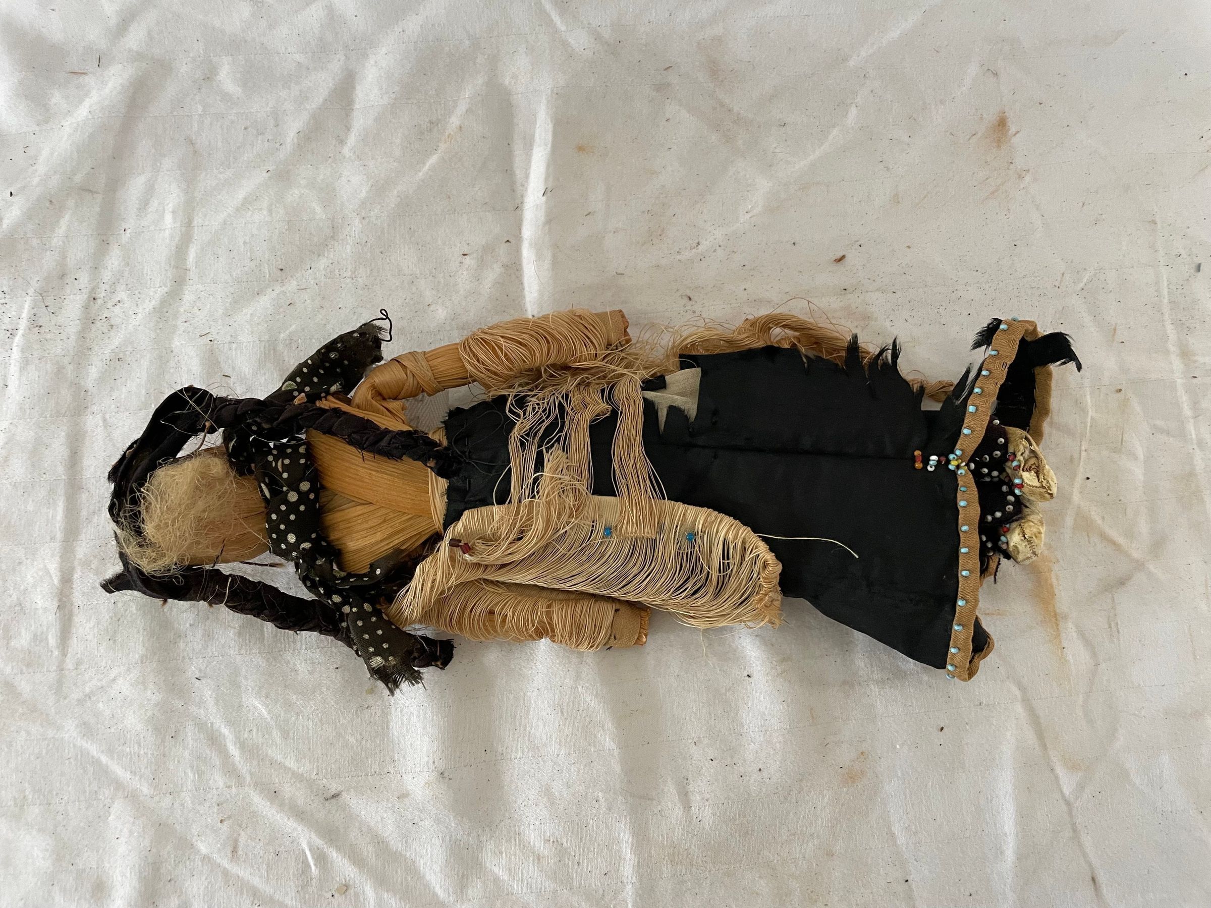A corn husk doll, outfitted with black dress, scarf, and beaded necklace. The doll is wearing moccasin shoes. The hair has detached and the doll has no face.
