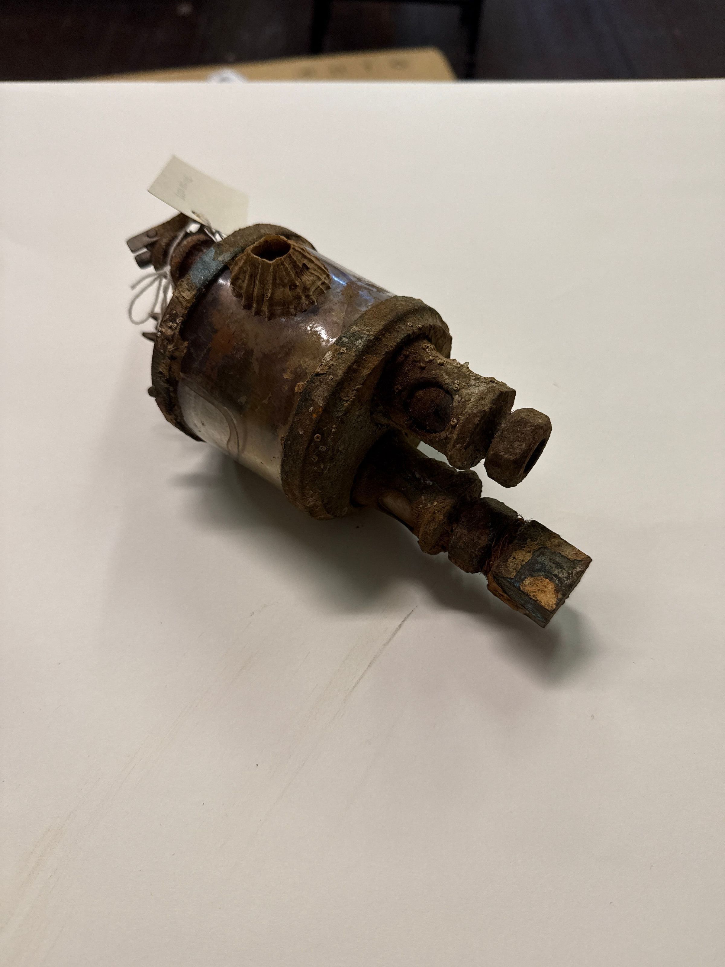 Glass and metal object with large barnacle. Handwritten label dated October 1974 reads: "Recovered from the FC Pendleton sunk in Seal Harbor, 1929. It is the hoisting engine oiler. Presented by Donald E. Pendleton"