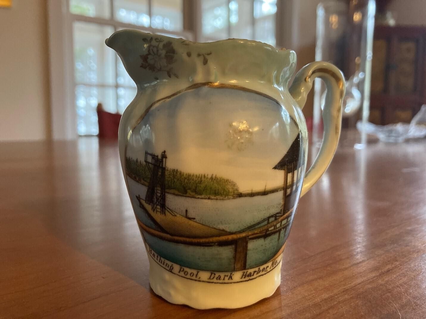 Small souvenir pitcher depicting the Bathing Pool at Dark Harbor. It was produced in Germany for W. A. Ricker, who ran a souvenir shop in Castine in the early 1900s, and who also kept a shop on Islesboro.