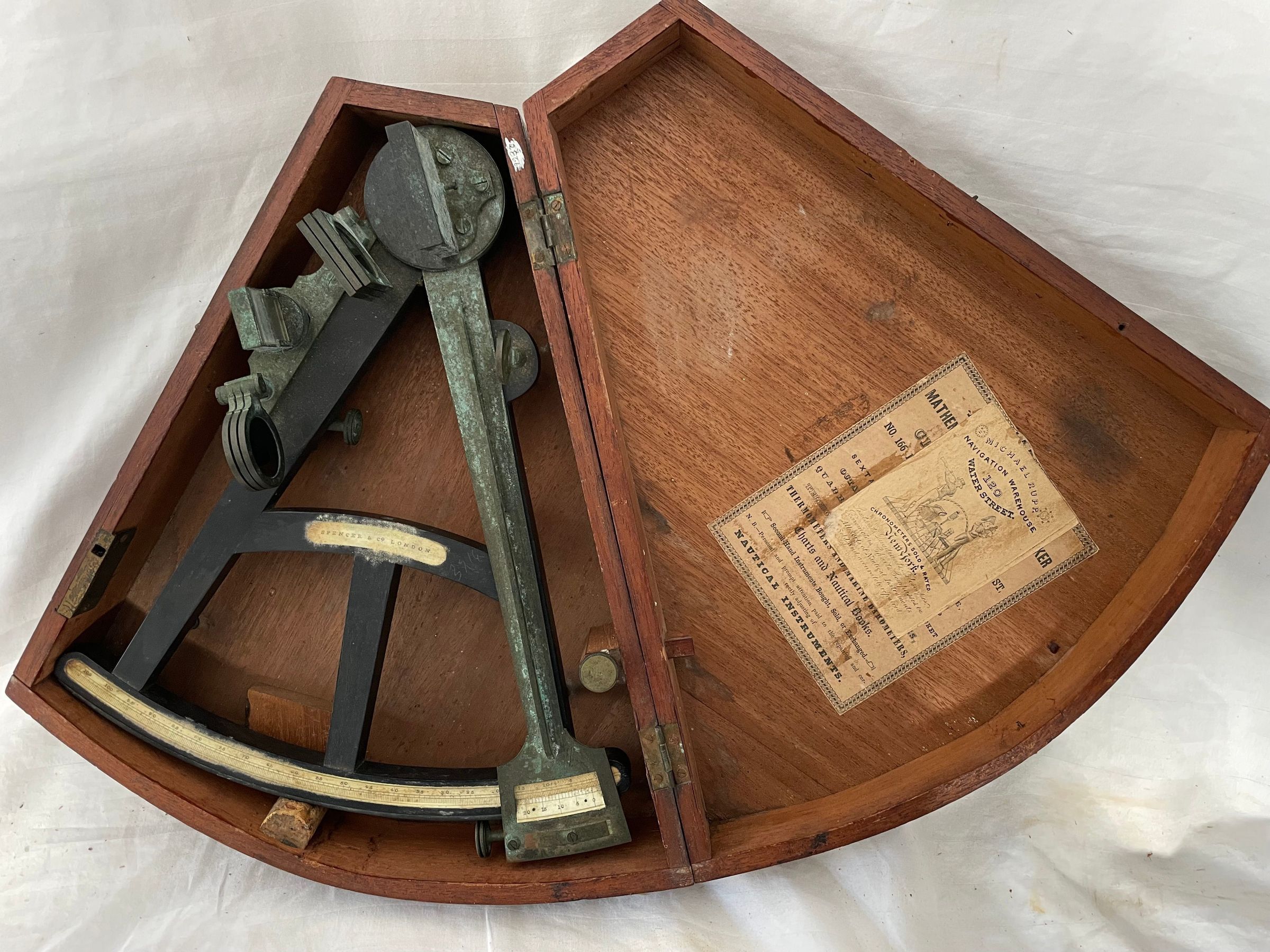 A wooden cased sextant manufactored by Michael Rupp. The top has stenciled C. Sherman