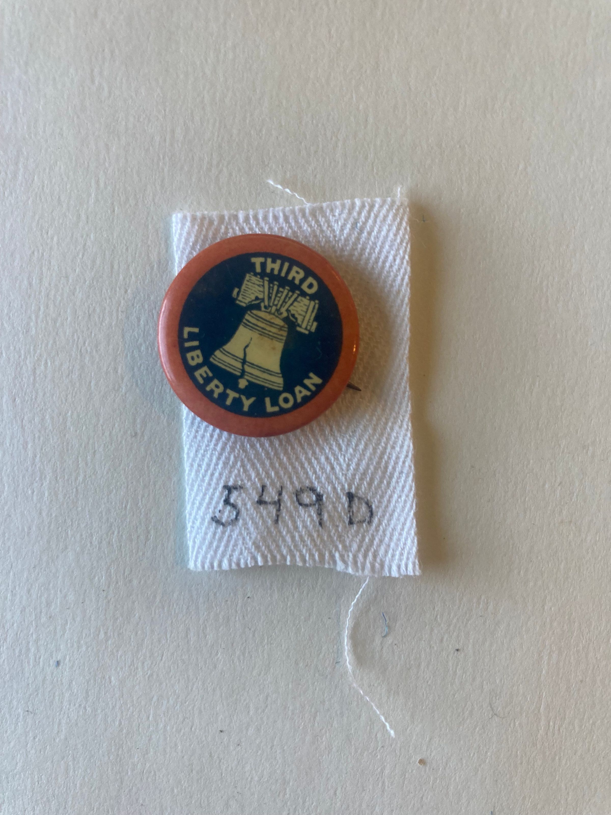 Third Liberty Loan button. Identifying cloth number tag is 549D. [Compare to item 1111.549.004. Might this be the same pin, but misfiled in box 1 rather than box 2? If so, correct catalog and eliminate the duplicate entry.]