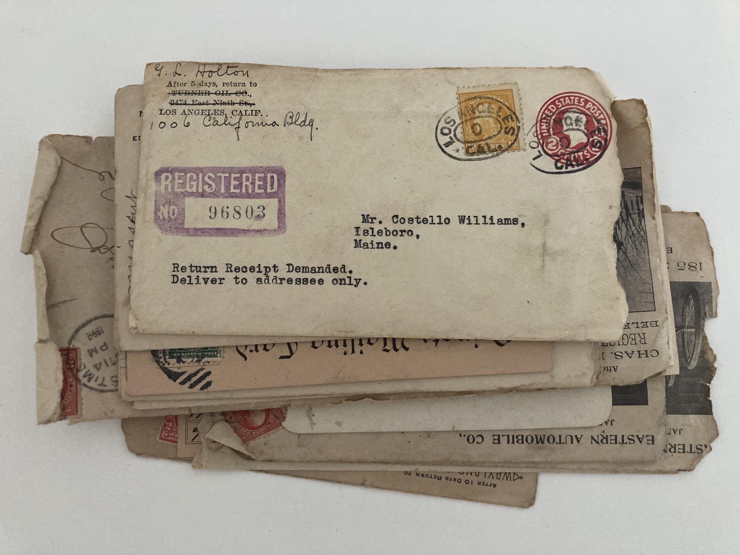 Business correspondence addressed to Costello M. Williams of Islesboro, comprising receipts, advertisements, contracts with Standard Oil for storage barrels, settlement of the Emily Turner estate, etc., circa 1900-1925.