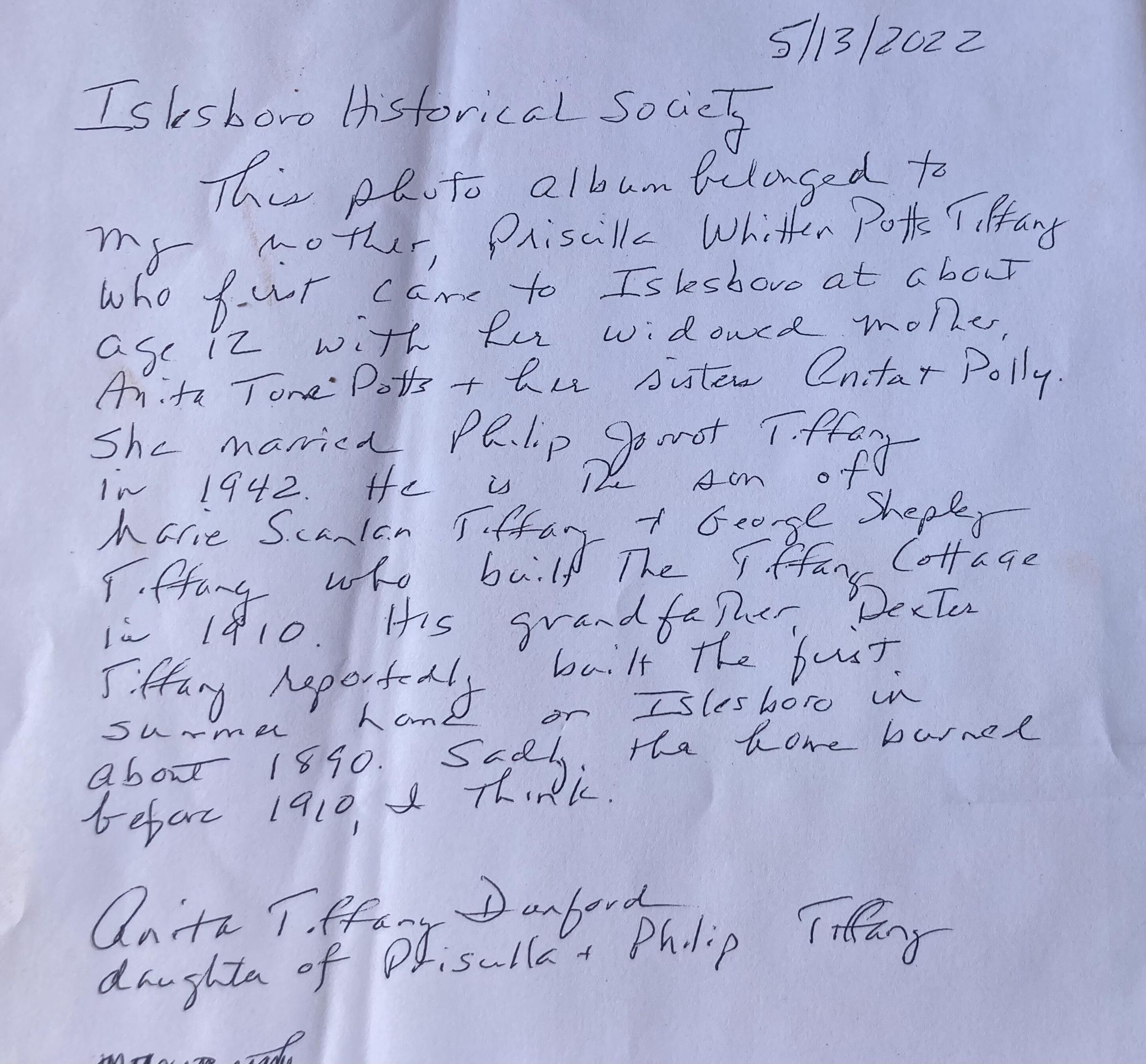 Letter accompanying delivery of a photograph album (2022.001.001), assembled by the donor's mother, Priscilla Whitten Potts Tiffany.